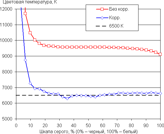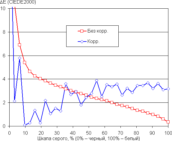 В итоге цвета имеют естественную насыщенность и оттенок. По умолчанию баланс оттенков на шкале серого плохой, так как цветовая температура существенно выше стандартных 6500 К. Отклонение от спектра абсолютно черного тела (ΔE) ниже 10, что для потребительского устройства считается приемлемым показателем, но значительно изменяется от оттенка к оттенку — это отрицательно сказывается на визуальной оценке цветового баланса. (Самые темные области шкалы серого можно не учитывать, так как там баланс цветов не имеет большого значения, да и погрешность измерений цветовых характеристик на низкой яркости большая.)