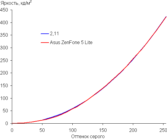 Контрастность (примерно в центре экрана) высокая — порядка 1040:1. Время отклика при переходе черный-белый-черный равно 18 мс (9 мс вкл. + 9 мс выкл.). Переход между полутонами серого 25% и 75% (по численному значению цвета) и обратно в сумме занимает 29 мс. Построенная по 32 точкам с равным интервалом по численному значению оттенка серого гамма-кривая не выявила завала ни в светах, ни в тенях. Показатель аппроксимирующей степенной функции равен 2,11, что немного ниже стандартного значения 2,2. При этом реальная гамма-кривая мало отклоняется от степенной зависимости: