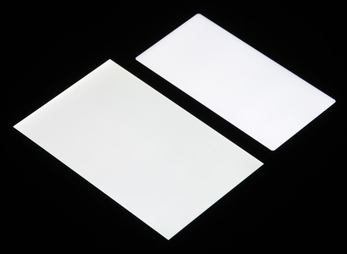 Яркость под углом у экранов уменьшилась (как минимум в 5 раз, исходя из разницы в выдержке), но у Asus ZenFone 5 Lite экран под этим углом все же чуть светлее. Черное поле при отклонении по диагонали высветляется сильно и приобретает синеватый оттенок. Фотографии ниже это демонстрируют (яркость белых участков в перпендикулярном плоскости экранов направлении одинаковая!):