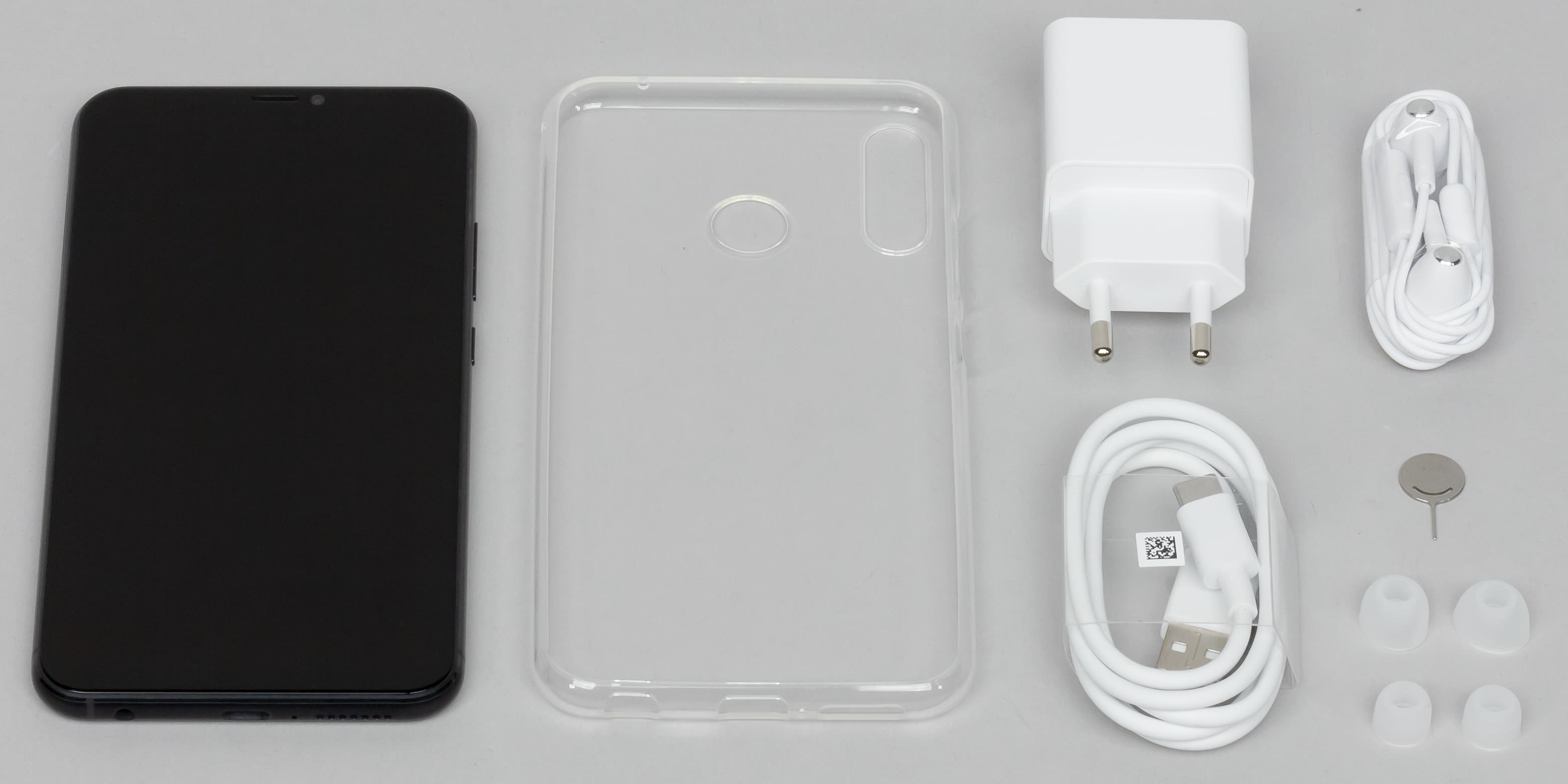 Внутри мы находим сам аппарат, прозрачный силиконовый чехол, зарядное устройство 5 В 2 А, кабель USB Type-С, наушники с запасными амбушюрами, а также металлический ключик для извлечения/установки SIM-карты и карточки microSD.
