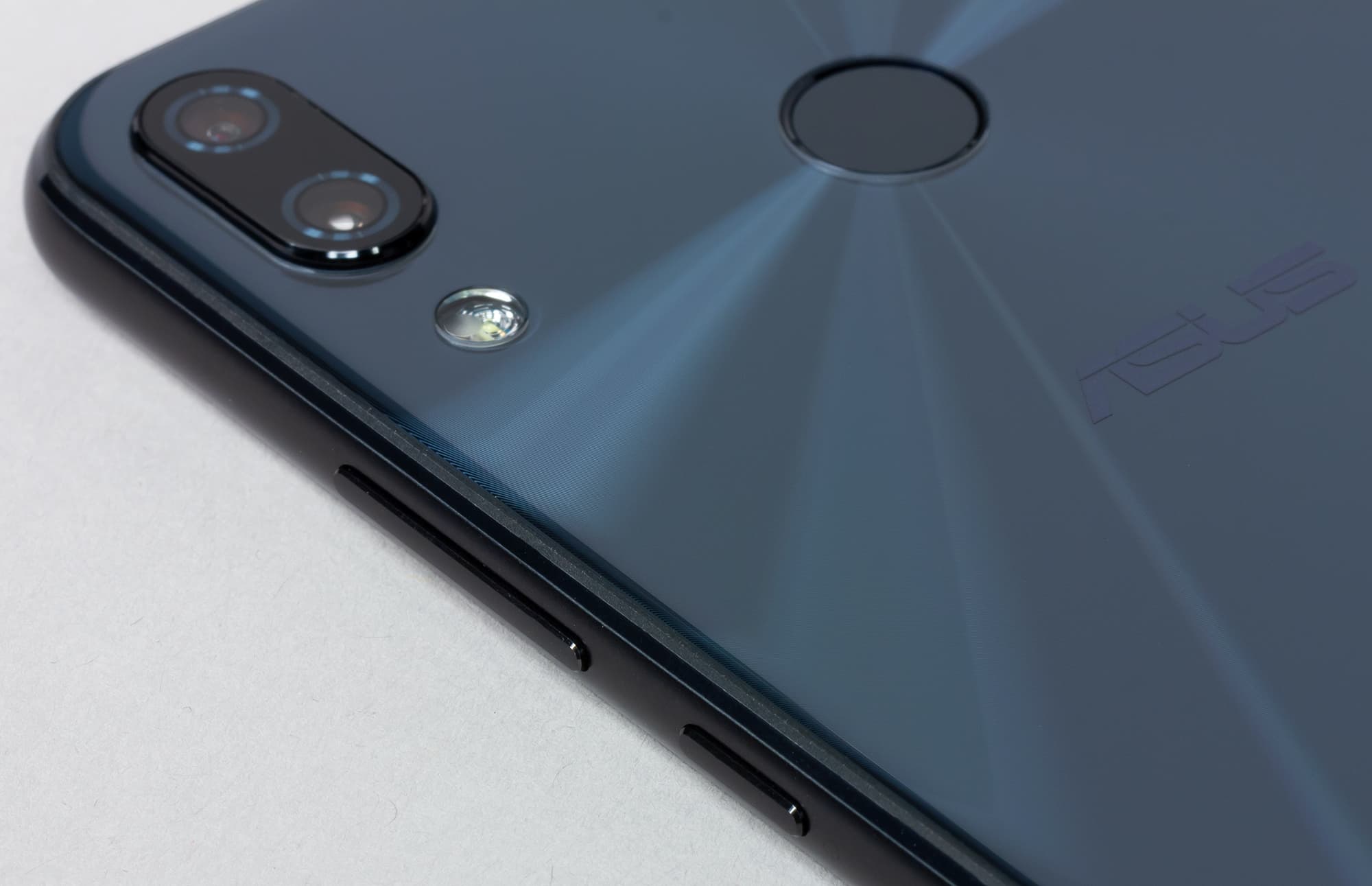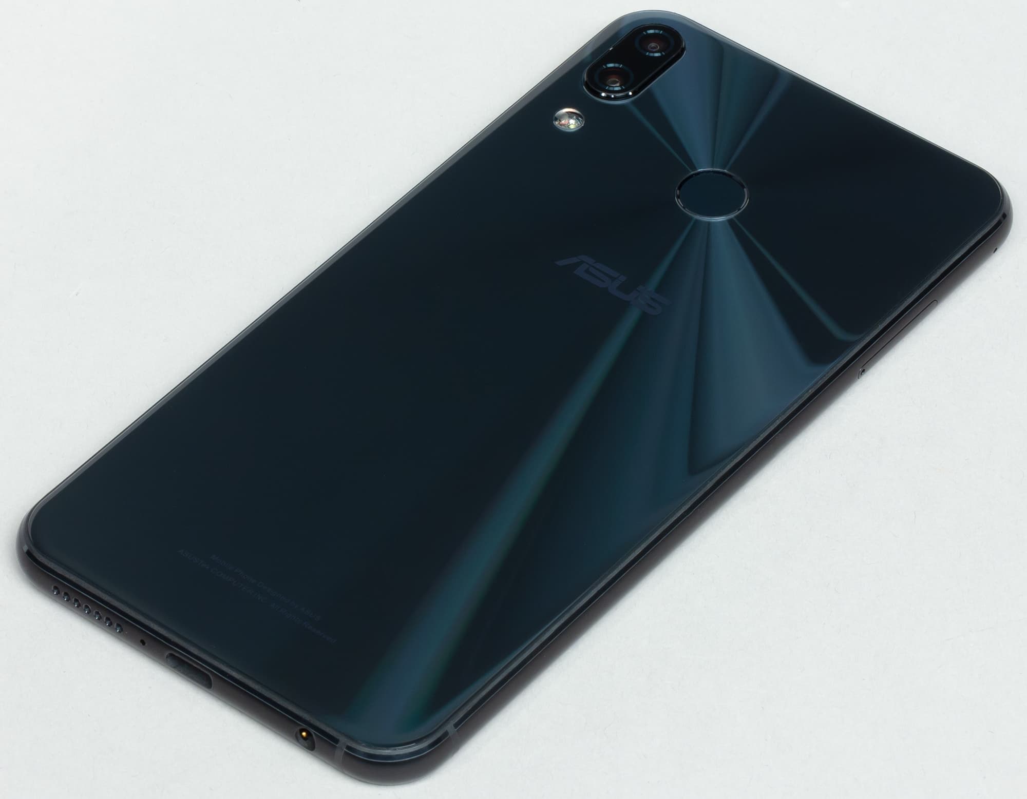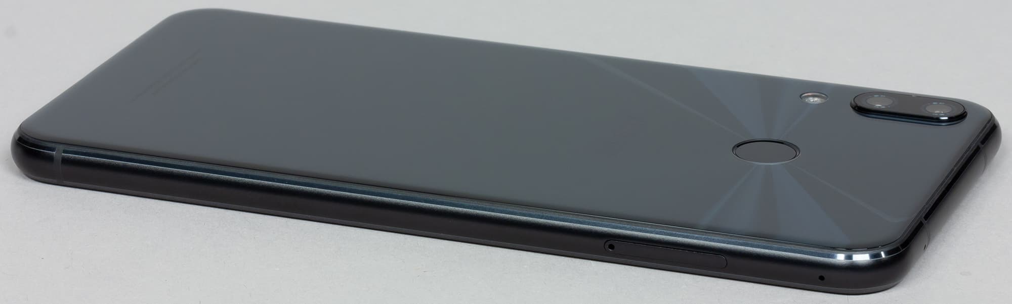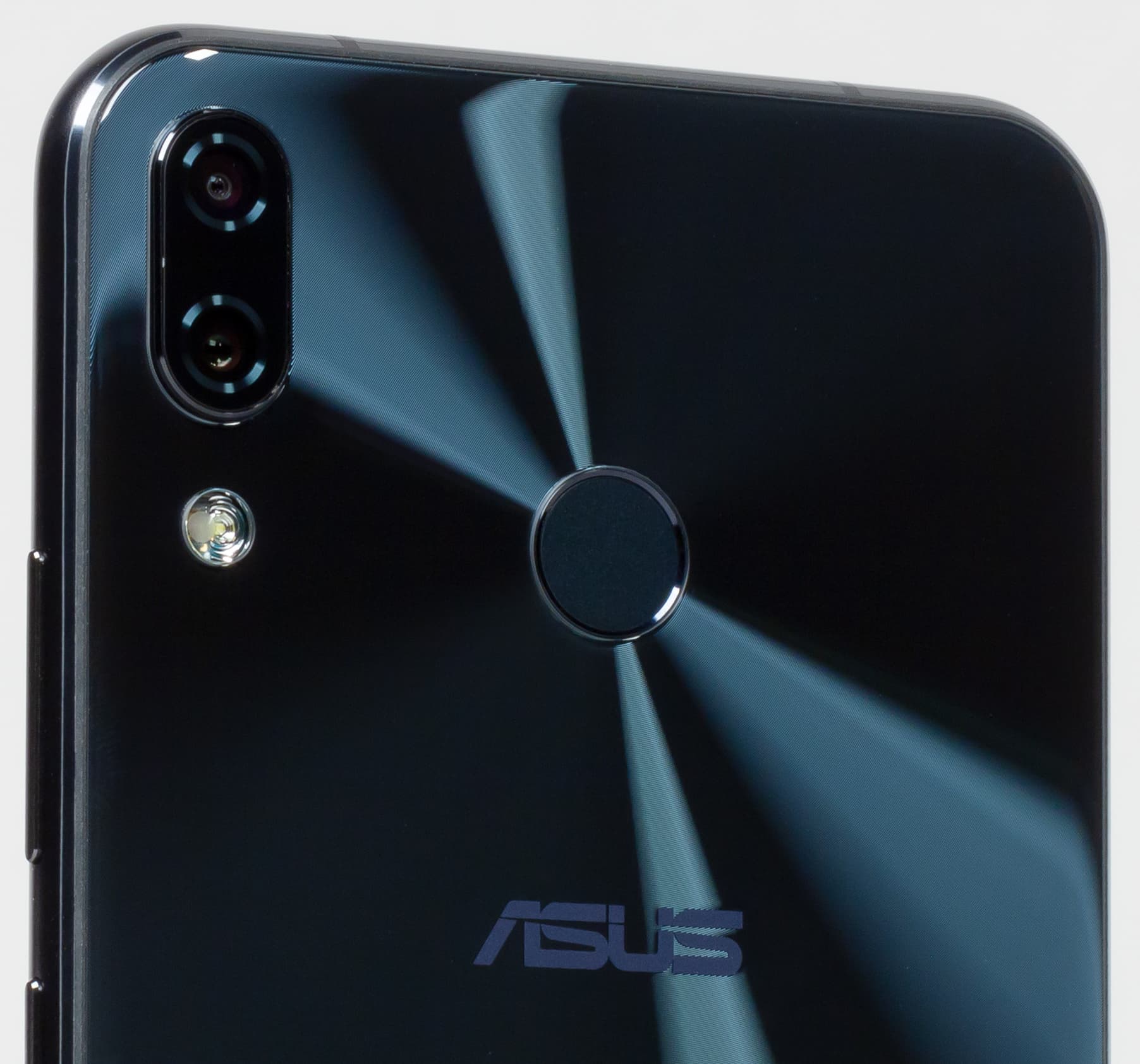 Второй момент: из-за отсутствия серебристых, плавно переходящих в тыловую поверхность граней он выглядит чуть менее эффектно, чем iPhone X, но зато очень интересные отражения света, образующие будто лучи, расходящиеся от сканера отпечатков пальцев, добавляют модели Asus оригинальности и шарма.