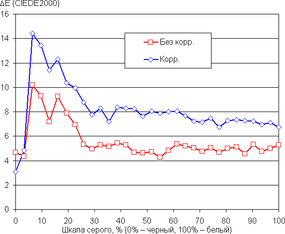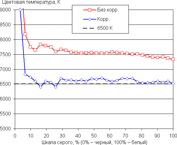 Баланс оттенков на шкале серого приемлемый, так как цветовая температура заметно выше стандартных 6500 К, но отклонение от спектра абсолютно черного тела (ΔE) ниже 10 единиц, что для потребительского устройства считается хорошим показателем (данные, подписанные как Без корр. на графиках ниже). При этом вариация цветовой температуры и ΔE не очень большая — это положительно сказывается на визуальной оценке цветового баланса. (Темные области шкалы серого можно не учитывать, так как там баланс цветов не имеет большого значения, да и погрешность измерений цветовых характеристик на низкой яркости большая.)
