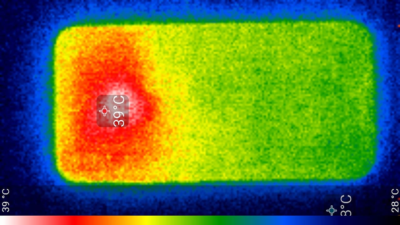 Нагрев локализован по центру в верхней части аппарата, что, видимо, соответствует расположению микросхемы SoC. По данным теплокамеры, максимальный нагрев составил 39 градусов (при температуре окружающего воздуха в 24 градуса), это относительно немного. Даже при запуске игровых тестов аппарат не перегревается и сохраняет комфортную температуру корпуса для пользователя.