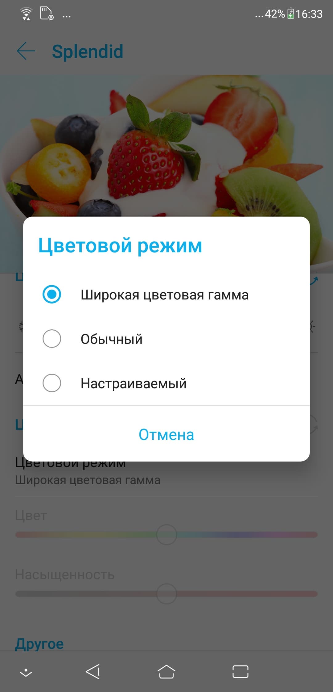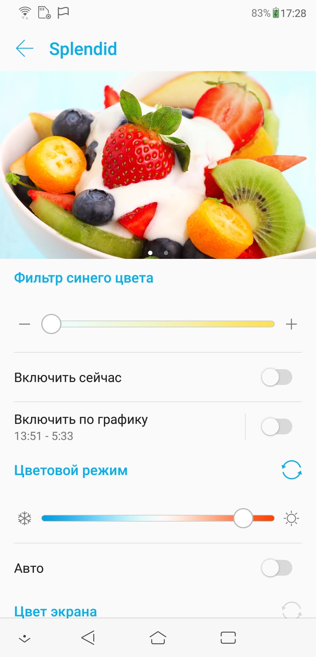 В этом смартфоне есть возможность подправить цветовой баланс регулировкой цветовой температуры (параметр Цветовой режим):