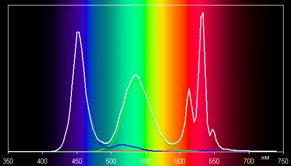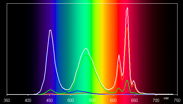 Видно, что охват близок к sRGB. Треугольник чуть кривоват, то есть коррекция не совсем точная, но это мелочи. И соответствующий спектр: