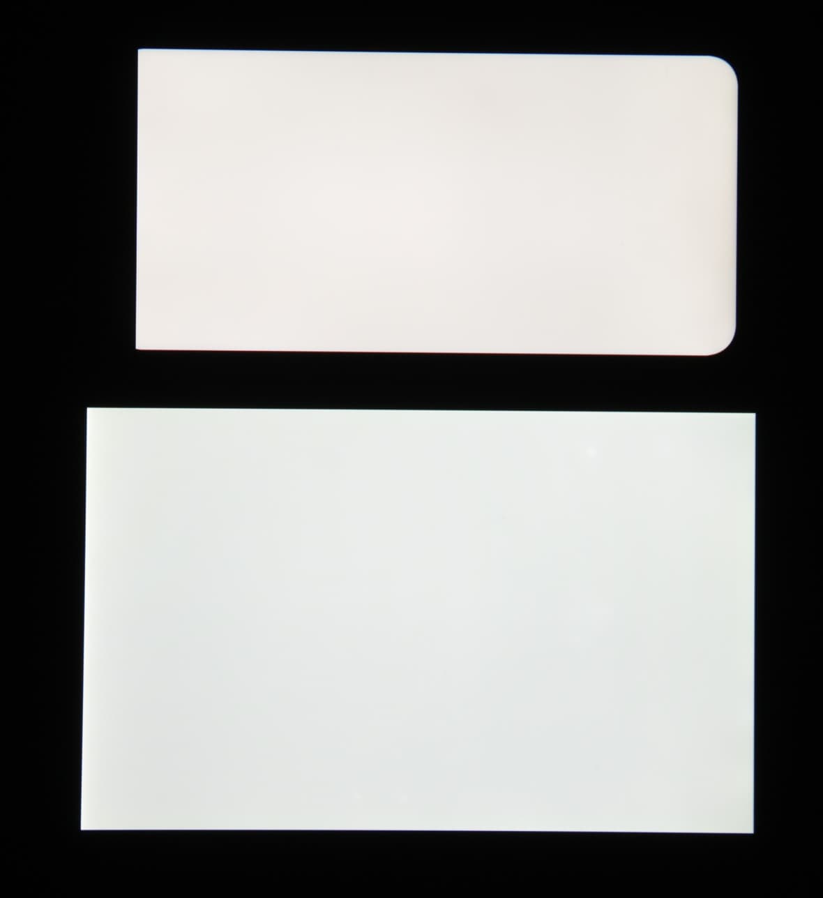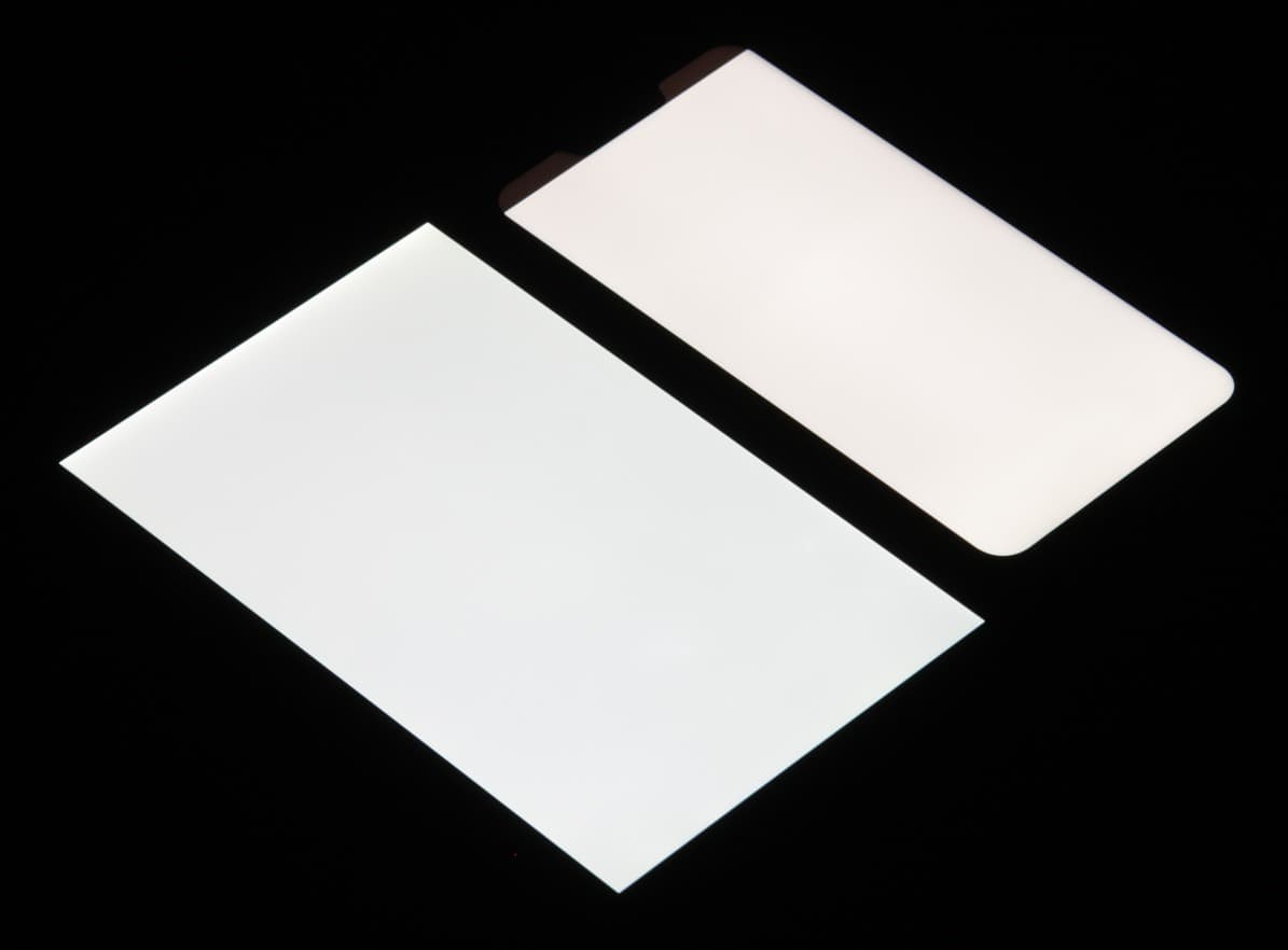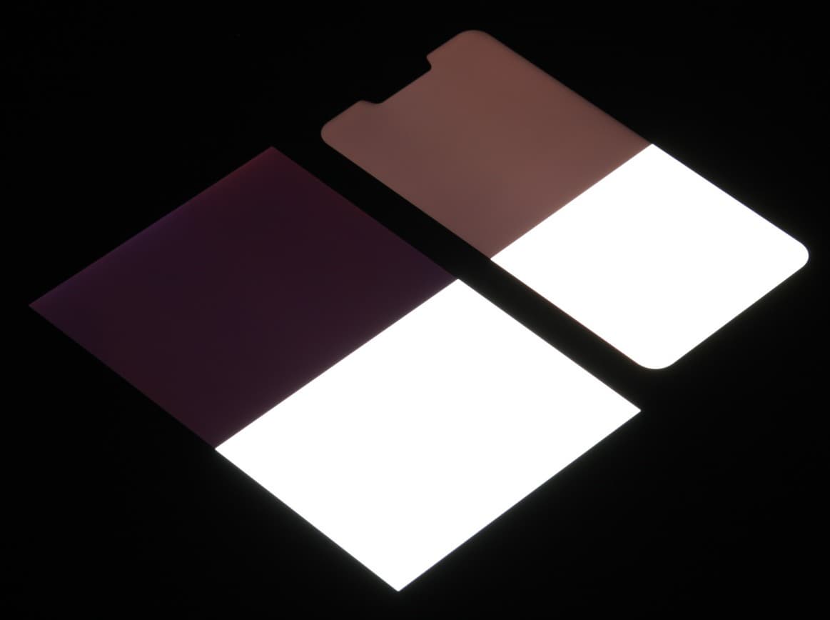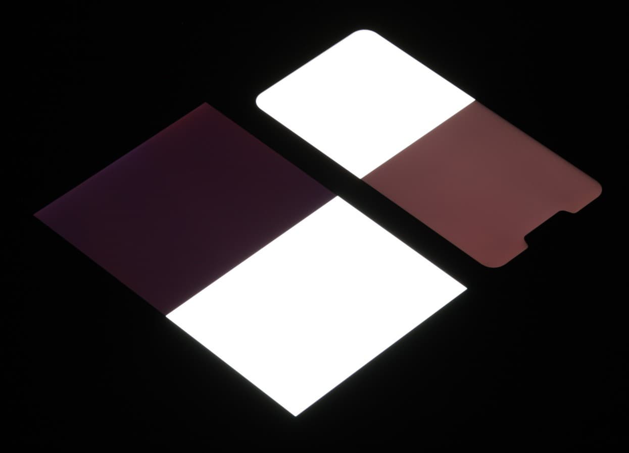 Яркость под углом у обоих экранов заметно уменьшилась, но в случае Asus ZenFone 5 падение яркости меньше. Черное поле при отклонении по диагонали высветляется сильно и приобретает красноватый оттенок. Фотографии ниже это демонстрируют (яркость белых участков в перпендикулярном плоскости экранов направлении у экранов одинаковая!):