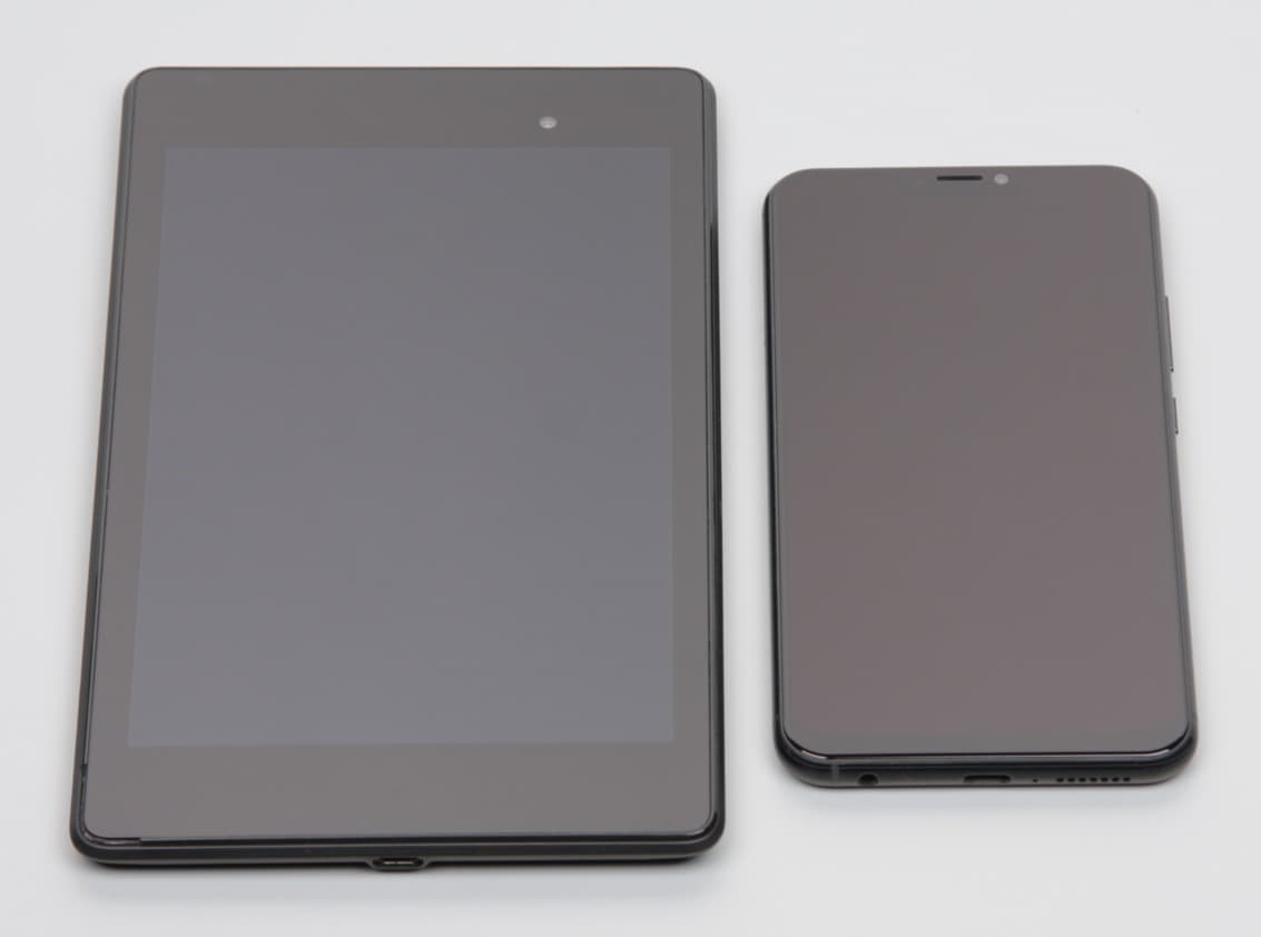 Лицевая поверхность экрана выполнена в виде стеклянной пластины с зеркально-гладкой поверхностью, устойчивой к появлению царапин. Судя по отражению объектов, антибликовые свойства экрана лучше, чем у экрана Google Nexus 7 (2013) (далее просто Nexus 7). Для наглядности приведем фотографию, на которой в выключенных экранах обоих устройств отражается белая поверхность (Asus ZenFone 5, как нетрудно определить, справа, далее их можно различать по размеру):