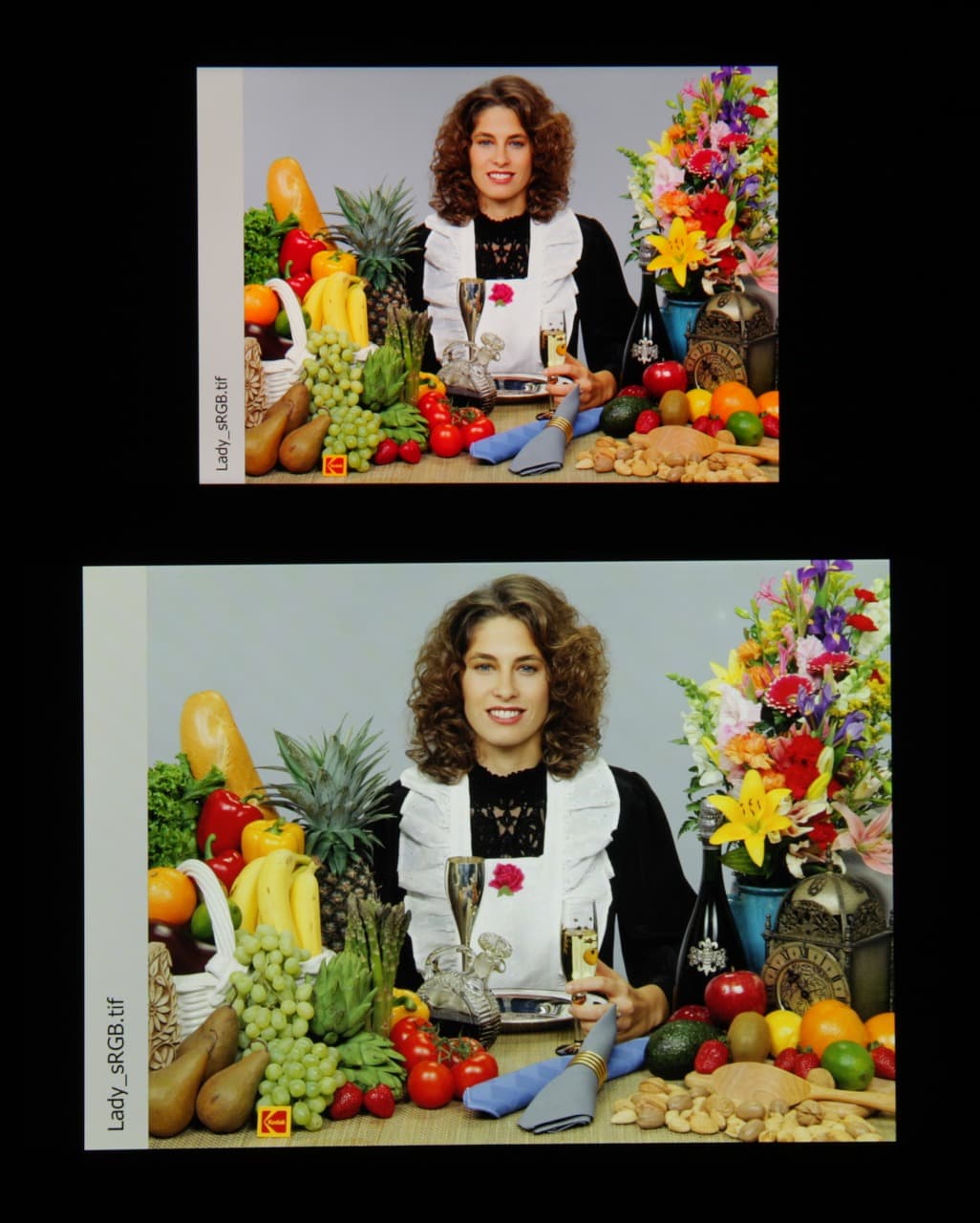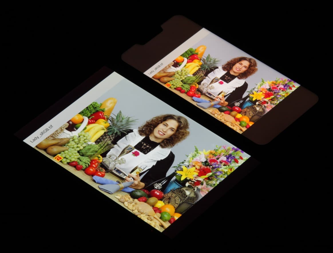 Они типичные для многих топовых мобильных устройств. По всей видимости, в этом экране используются светодиоды с синим излучателем и зеленым и красным люминофором (обычно — синий излучатель и желтый люминофор), что в сочетании со специальными светофильтрами матрицы и позволяет получить широкий цветовой охват. Да, и в красном люминофоре, видимо, используются так называемые квантовые точки. К сожалению, в итоге цвета изображений — рисунков, фотографий и фильмов, — ориентированных на пространство sRGB (а таких подавляющее большинство), имеют неестественную насыщенность. Особенно это заметно на узнаваемых оттенках, например на оттенках кожи. Результат приведен на фотографиях выше.
