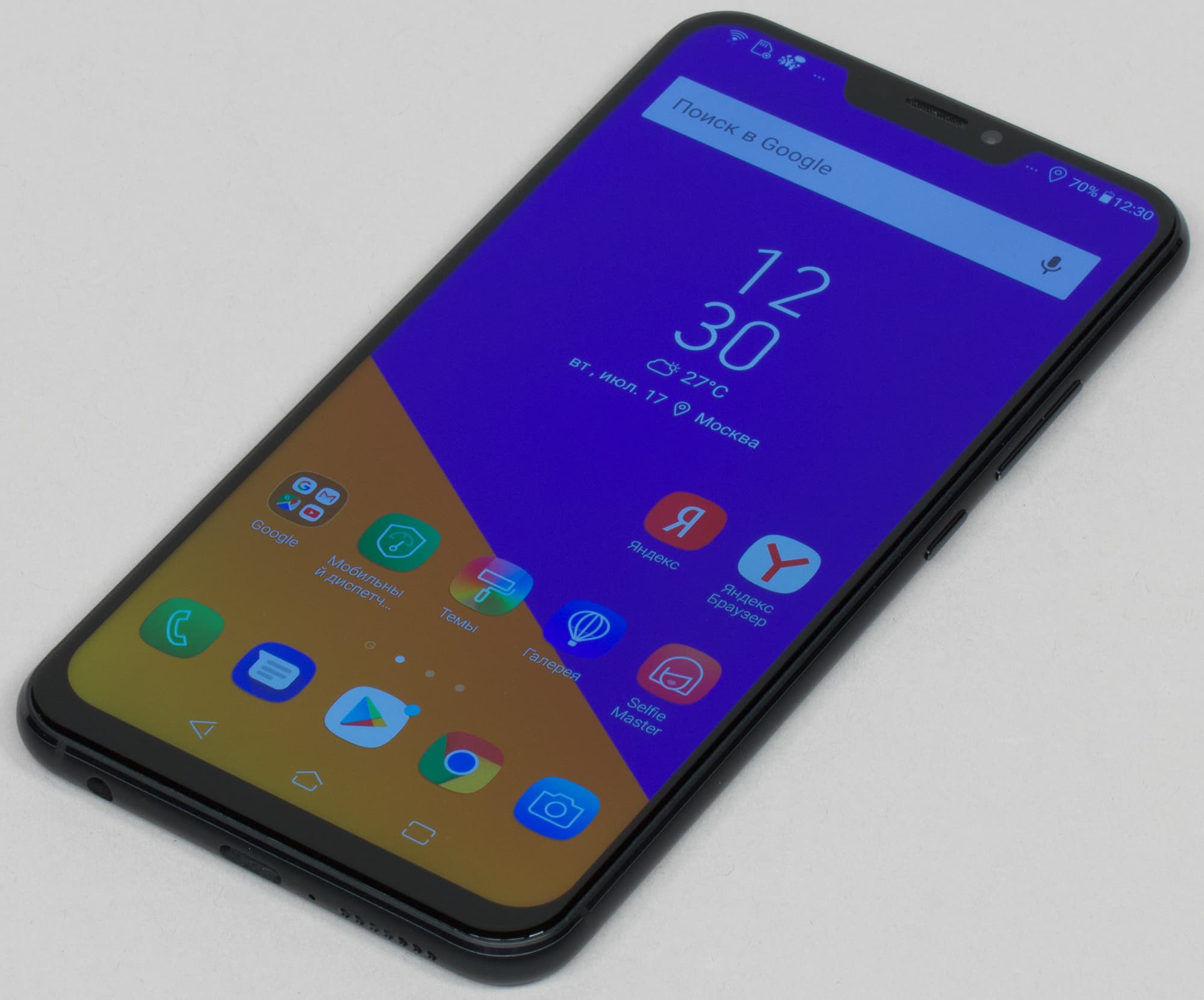 Стекло — как со стороны экрана, так и на тыльной поверхности — имеет небольшое закругление по граням, что принято называть 2.5D. И хотя этим пользователей уже не удивишь даже в бюджетном сегменте, все равно прием кажется удачным. Что касается соотношения сторон экрана (18,7:9 если брать только «основную часть»), то оно оптимально для просмотра фильмов и работы с любыми списками (писем, заметок, покупок и пр.). Asus уже давно сделала ставку на этот формат и придерживается его во всех новых моделях.