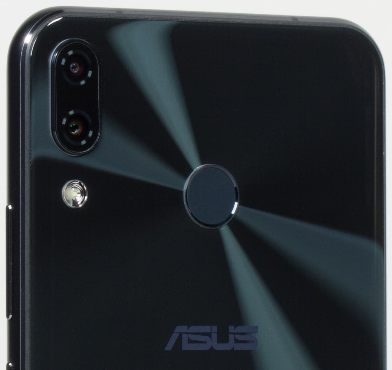 Второй момент: из-за отсутствия серебристых, плавно переходящих в тыловую поверхность граней он выглядит чуть менее эффектно, чем iPhone X, но зато очень интересные отражения света, образующие будто лучи, расходящиеся от сканера отпечатков пальцев, добавляют модели Asus оригинальности и шарма.