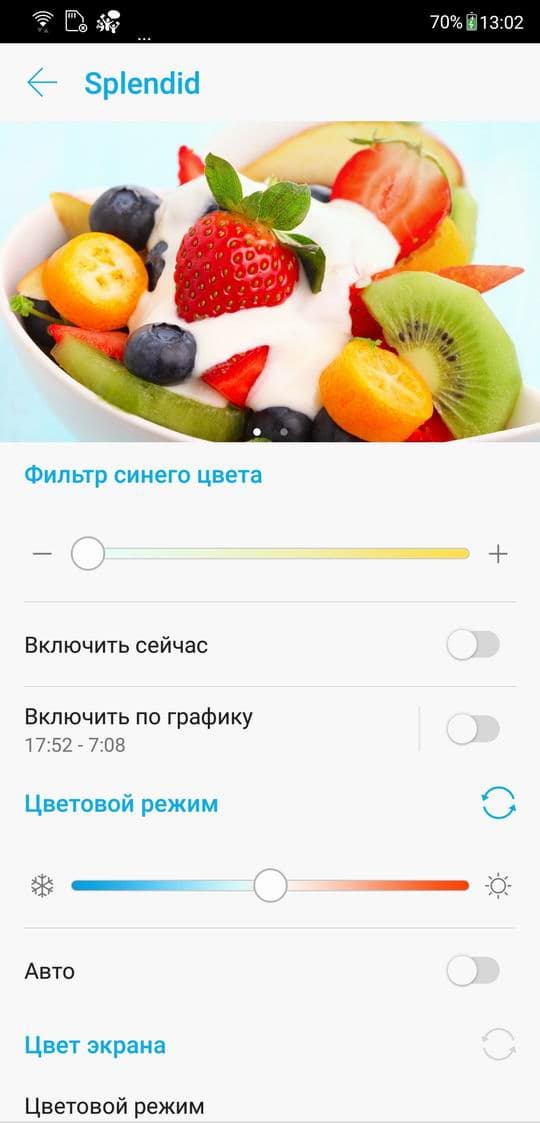 В этом смартфоне есть возможность подправить цветовой баланс регулировкой цветовой температуры (параметр Цветовой режим):