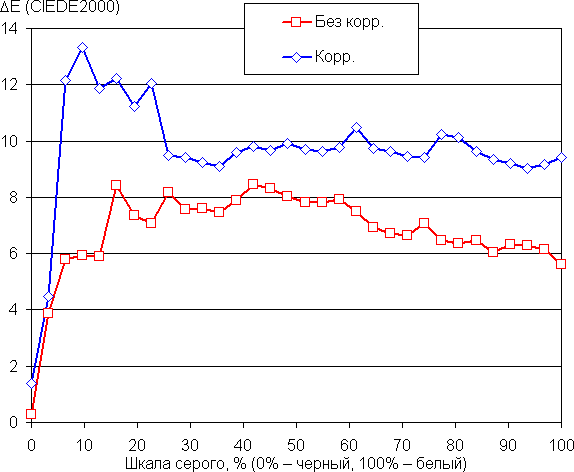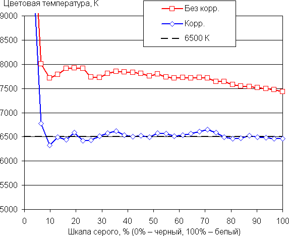 Баланс оттенков на шкале серого приемлемый, так как цветовая температура заметно выше стандартных 6500 К, но отклонение от спектра абсолютно черного тела (ΔE) ниже 10 единиц, что для потребительского устройства считается хорошим показателем (данные, подписанные как Без корр. на графиках ниже). При этом вариация цветовой температуры и ΔE не очень большая — это положительно сказывается на визуальной оценке цветового баланса. (Темные области шкалы серого можно не учитывать, так как там баланс цветов не имеет большого значения, да и погрешность измерений цветовых характеристик на низкой яркости большая.)
