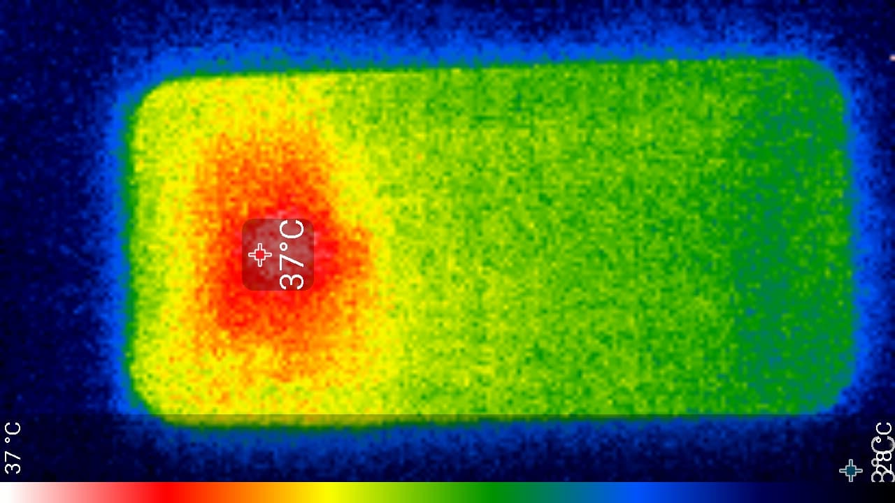 Нагрев локализован по центру в верхней части аппарата, что, видимо, соответствует расположению микросхемы SoC. По данным теплокамеры, максимальный нагрев составил 37 градусов (при температуре окружающего воздуха в 24 градуса), это не очень много.