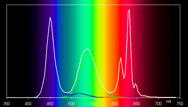 Видно, что охват близок к sRGB. Треугольник чуть кривоват, то есть коррекция не совсем точная, но это мелочи. И соответствующий спектр: