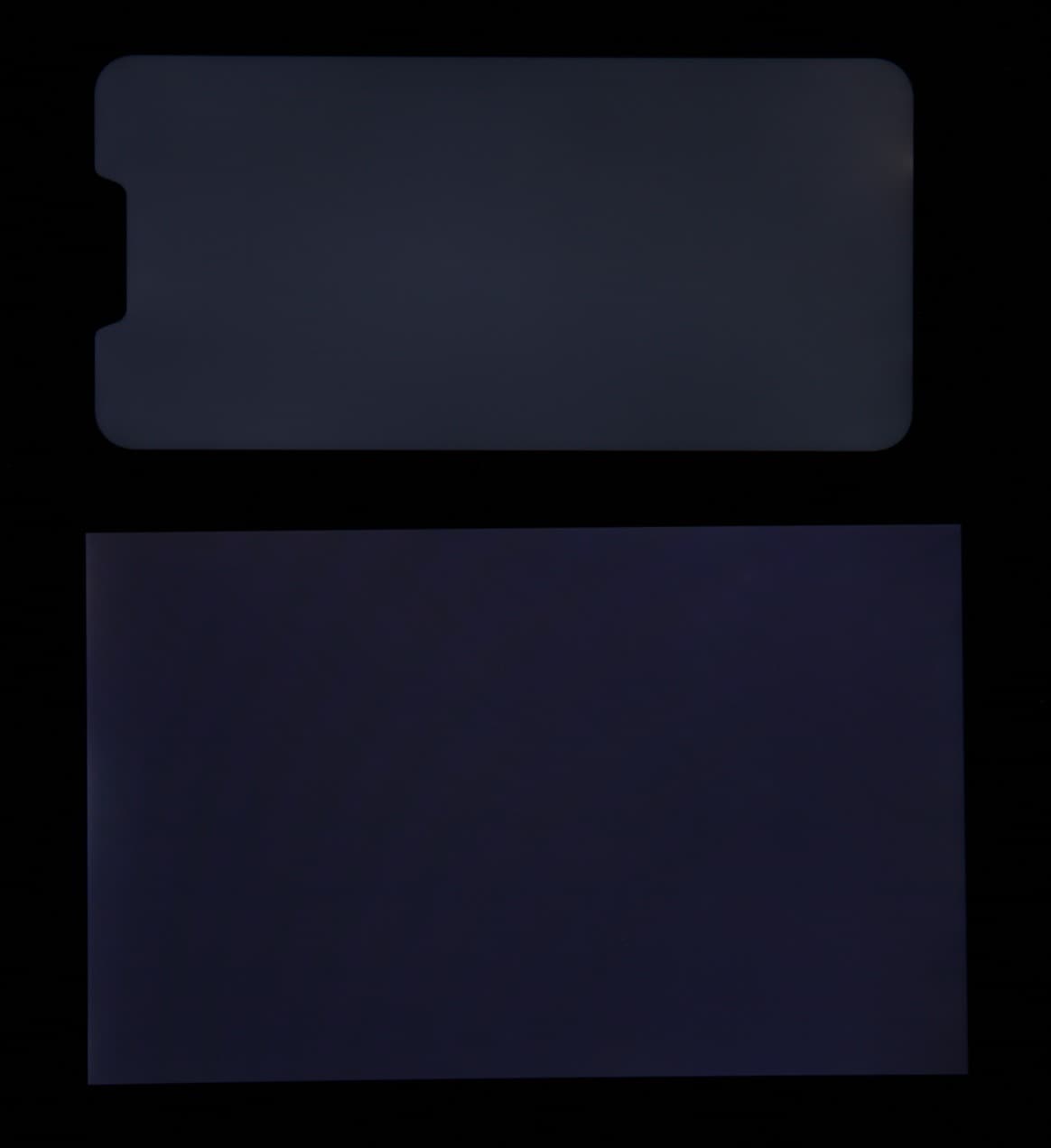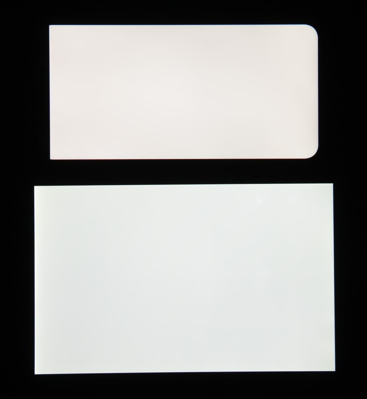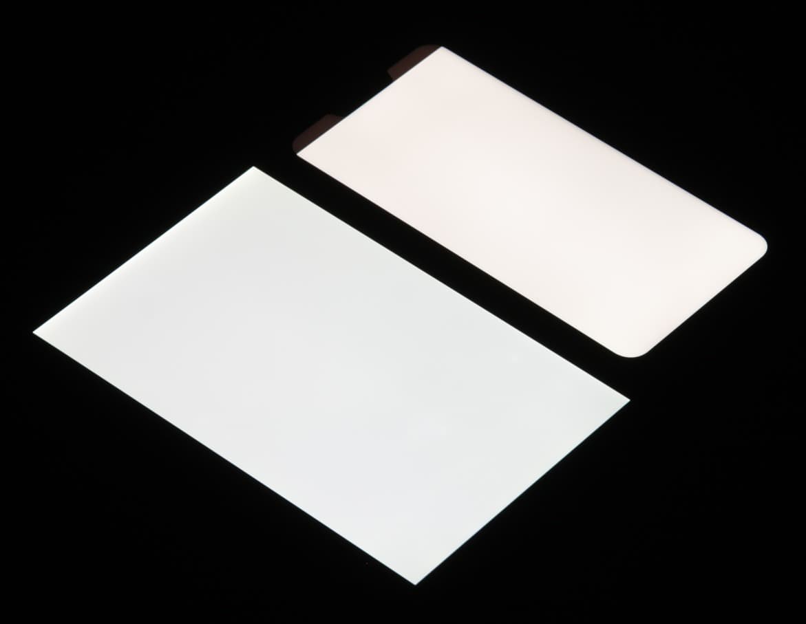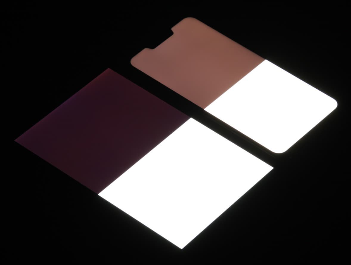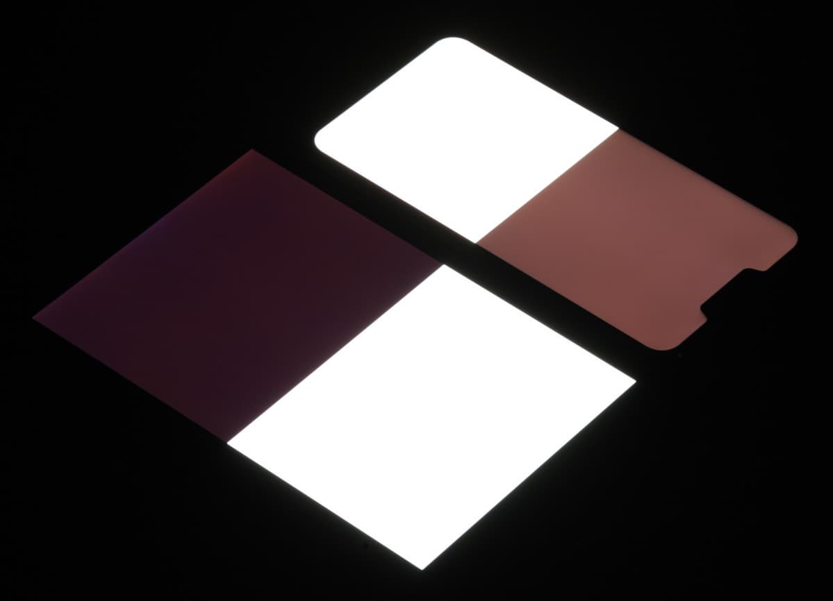 Яркость под углом у обоих экранов заметно уменьшилась, но в случае Asus Zenfone 5Z падение яркости меньше. Черное поле при отклонении по диагонали высветляется сильно и приобретает красноватый оттенок. Фотографии ниже это демонстрируют (яркость белых участков в перпендикулярном плоскости экранов направлении у экранов одинаковая!):