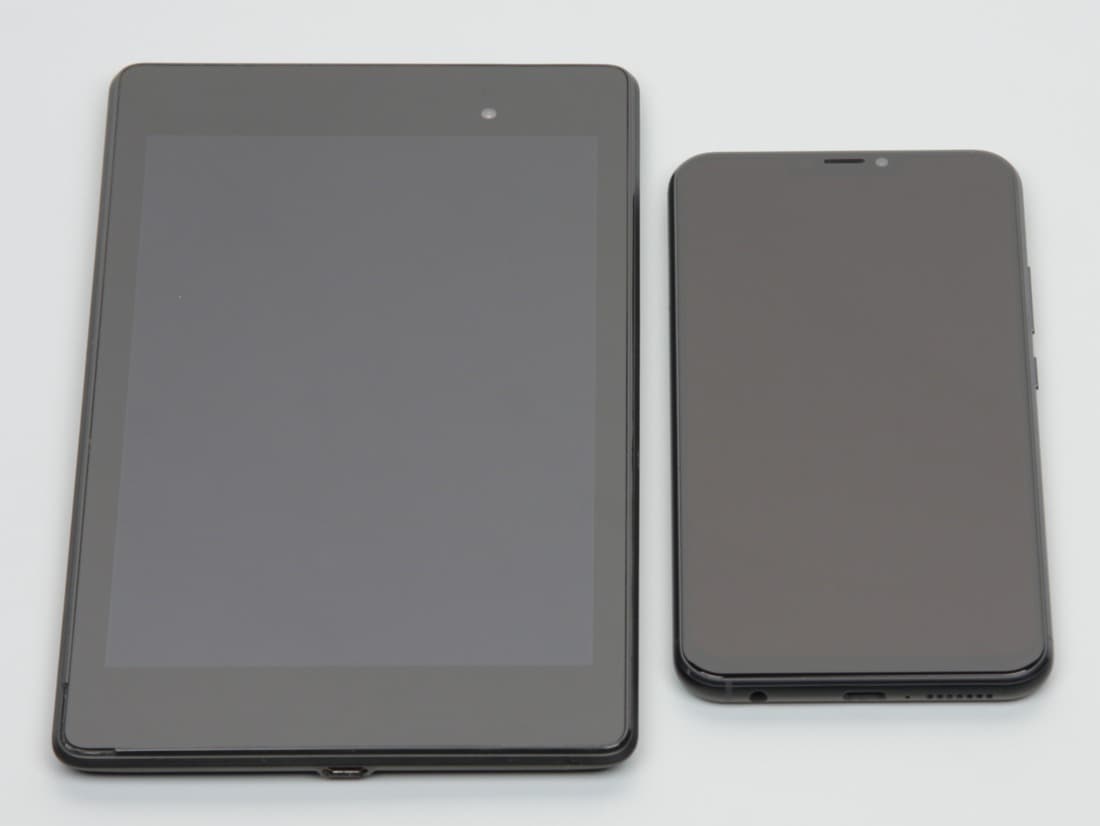 Лицевая поверхность экрана выполнена в виде стеклянной пластины с зеркально-гладкой поверхностью, устойчивой к появлению царапин. Судя по отражению объектов, антибликовые свойства экрана лучше, чем у экрана Google Nexus 7 (2013) (далее просто Nexus 7). Для наглядности приведем фотографию, на которой в выключенных экранах обоих устройств отражается белая поверхность (Asus Zenfone 5Z, как нетрудно определить, справа, далее их можно различать по размеру):