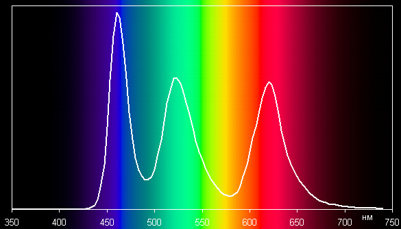 Спектры типичны для OLED — области первичных цветов хорошо разделены и имеют вид относительно узких и примерно одинаковых по форме пиков: