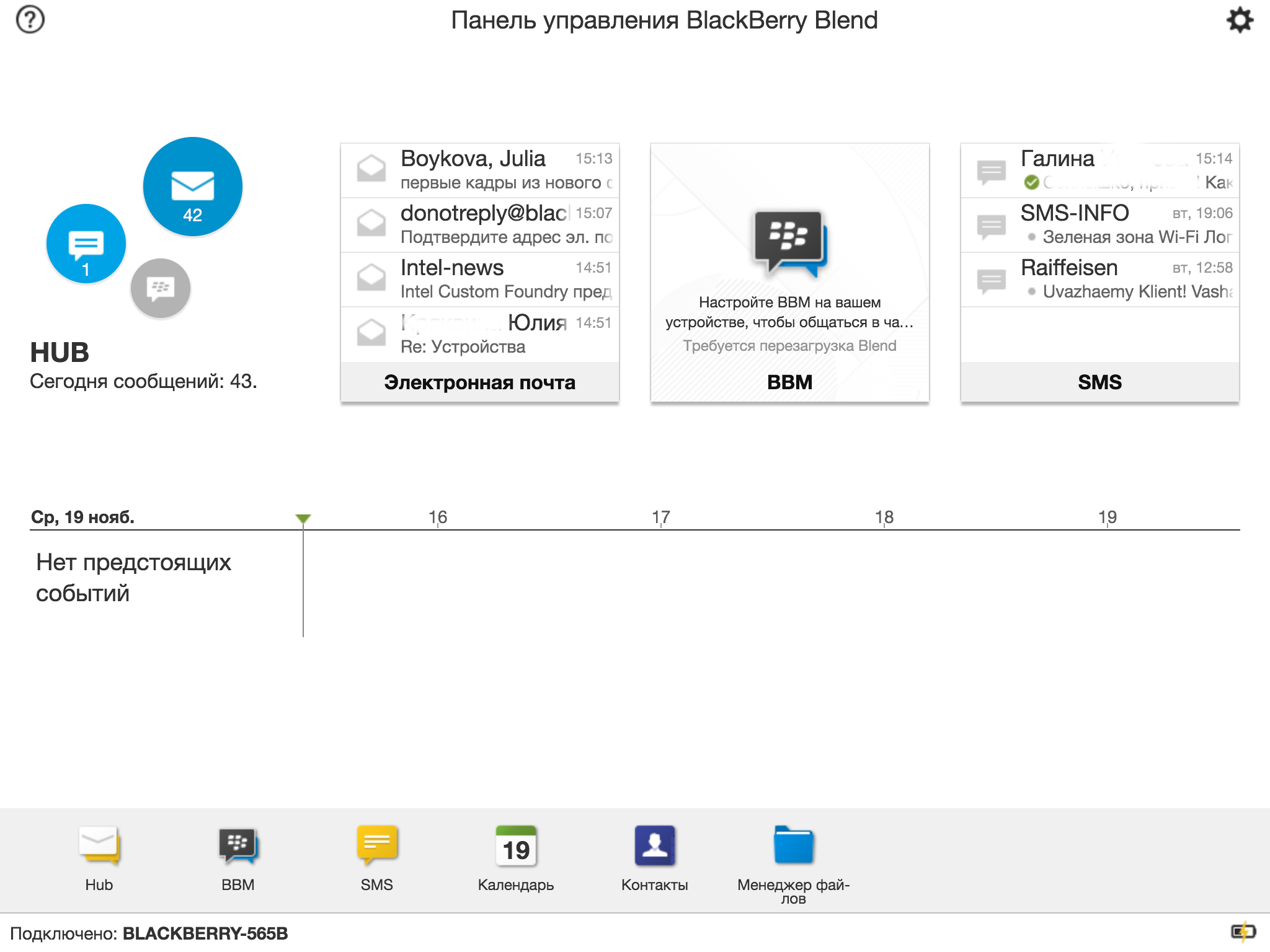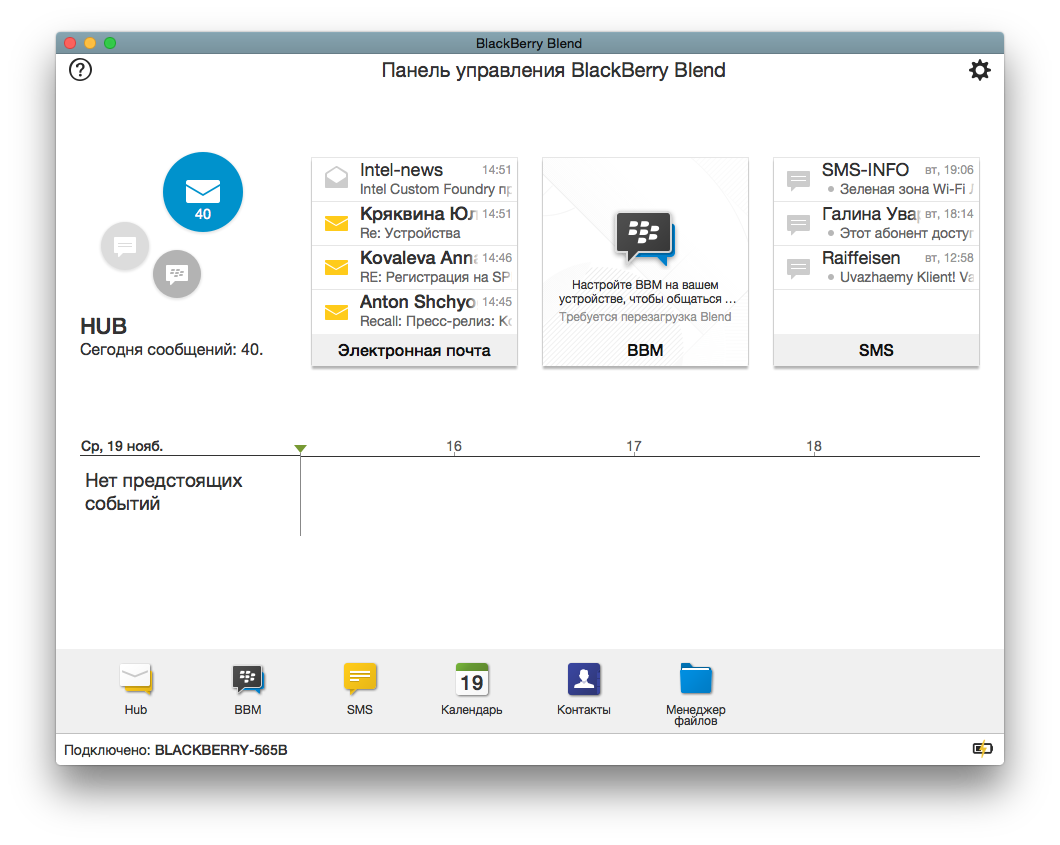 На панели внизу видно, с какими именно приложениями мы можем работать через BlackBerry Blend. А в карточках выше отображается самое новое содержимое этих приложений. Откроем BlackBerry Hub.