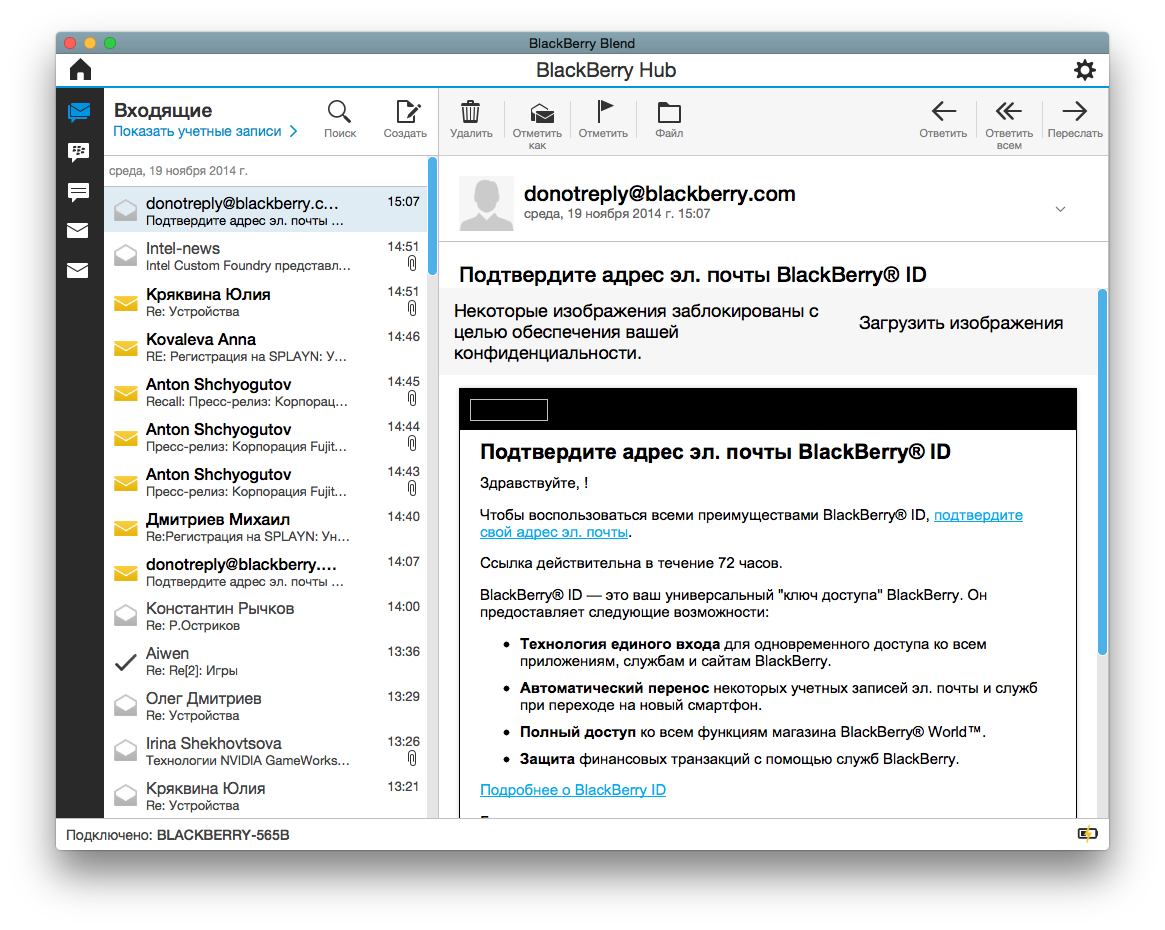 Мы начнем с версии для Mac. Итак, скачиваем DMG-файл, устанавливаем его, запускаем, входим в наш BlackBerry ID, после чего видим такую картину.