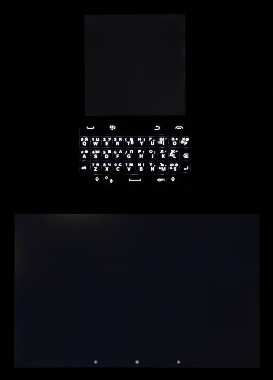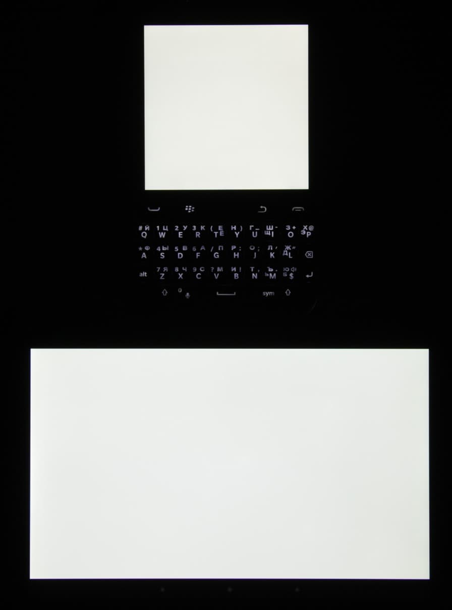 Яркость под углом у экранов уменьшилась (как минимум в 5 раз, исходя из разницы в выдержке), но в случае BlackBerry Classic падение яркости чуть больше. Черное поле при отклонении по диагонали высветляется сильно и приобретает фиолетовый, или красно-фиолетовый оттенок, или остается примерно нейтрально-серым. Фотографии ниже это демонстрируют (яркость белых участков в перпендикулярном плоскости экранов направлении примерно одинаковая!):