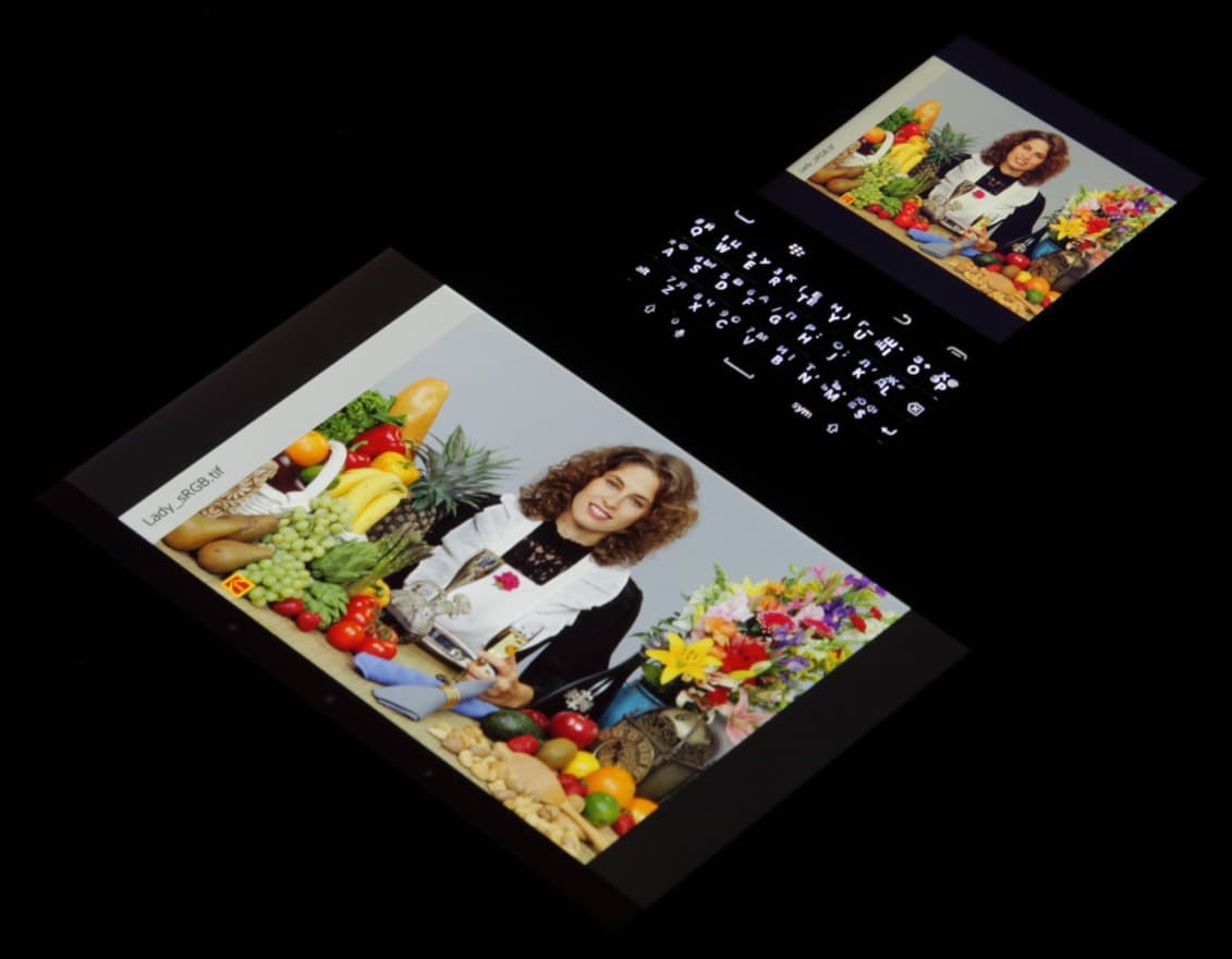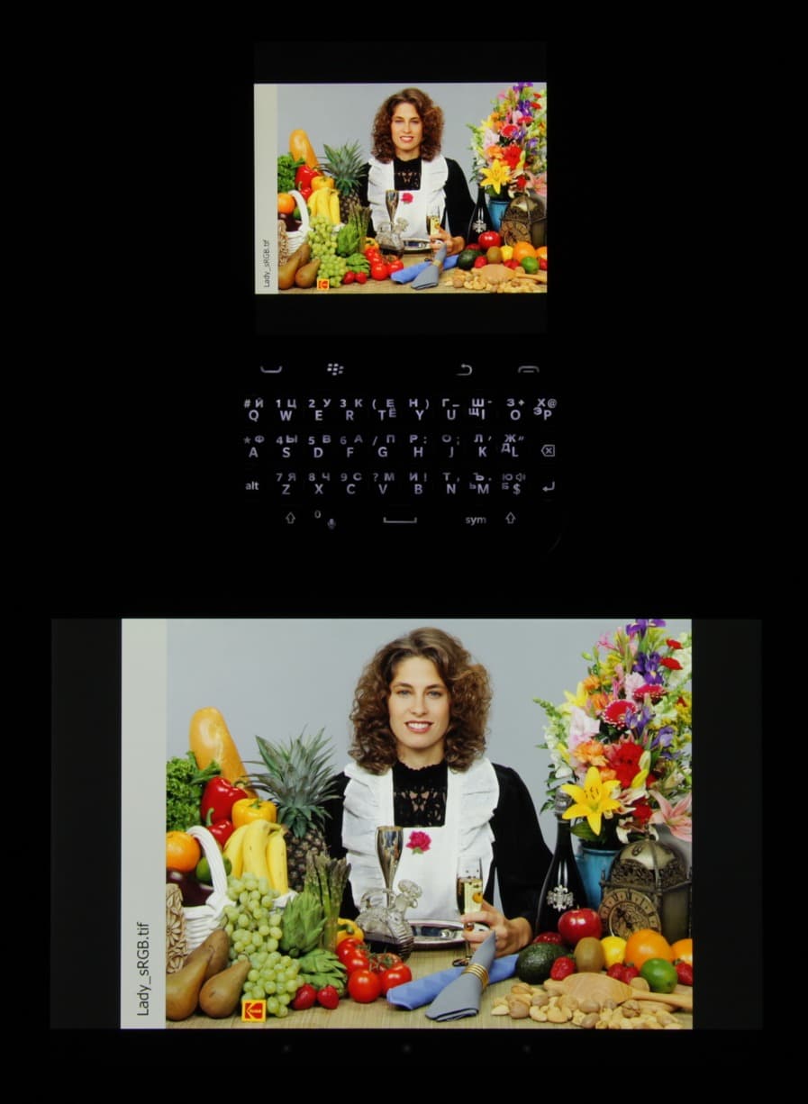 Видно, что цвета не сильно изменились у обоих экранов, но контраст у BlackBerry Classic уменьшился в большей степени из-за большего высветления черного и уменьшения яркости в целом. И белое поле: