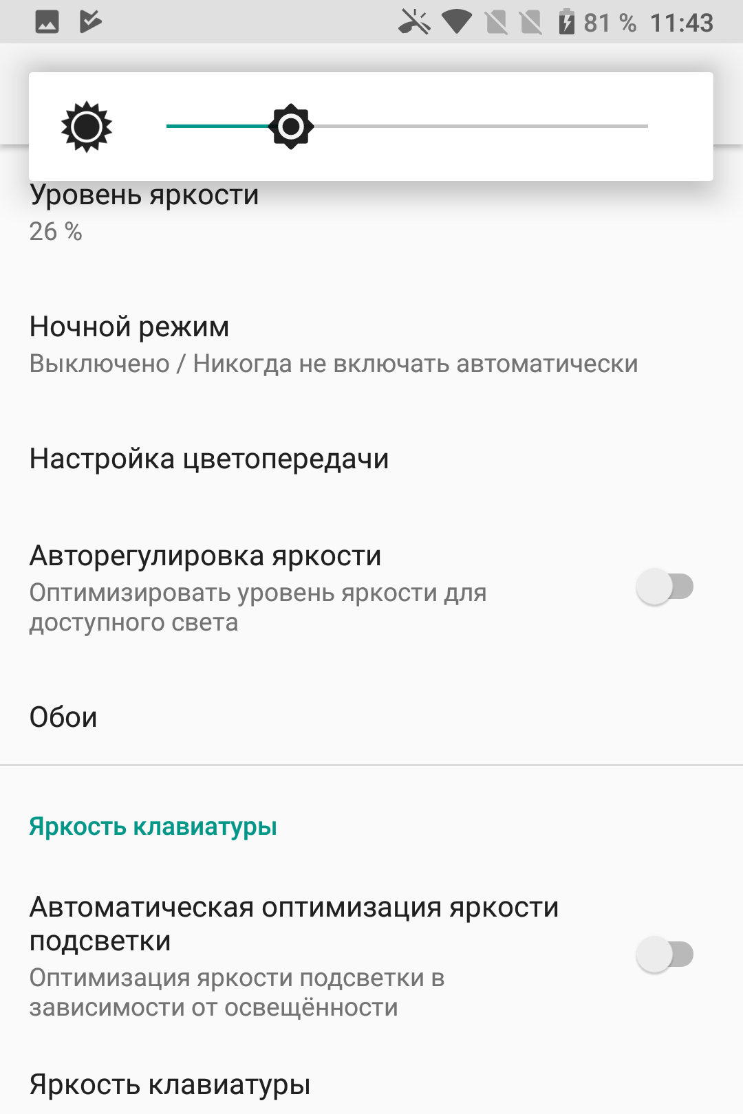 При ручном управлении яркостью и при выводе белого поля во весь экран максимальное значение яркости составило около 420 кд/м², минимальное — 4,2 кд/м². В наличии автоматическая регулировка яркости по датчику освещенности (он находится справа от прорези фронтального громкоговорителя). В автоматическом режиме при изменении внешних условий освещенности яркость экрана как повышается, так и понижается. Работа этой функции зависит от положения ползунка регулировки яркости. Если он на 50%, то в полной темноте функция автояркости уменьшает яркость до 4,2 кд/м² (темновато), в условиях освещенного искусственным светом офиса (около 550 лк) устанавливает на 150 кд/м² (нормально), в очень ярком окружении (соответствует освещению ясным днем вне помещения, но без прямого солнечного света — 20000 лк или немного больше) яркость повышается до 565 кд/м² (это существенно выше, чем при ручной регулировке). Результат нас не совсем устроил, поэтому мы переместили ползунок на 58% и получили 15, 180 и 565 кд/м² (подходящие значения). Получается, что функция автоподстройки яркости работает адекватно и позволяет пользователю настраивать свою работу под индивидуальные требования. Максимальная яркость в случае автоматической регулировки очень высокая, так что, учитывая отличные антибликовые свойства, читаемость экрана даже в солнечный день вне помещения должна быть на хорошем уровне. В полной темноте можно получить комфортный уровень яркости. На любом уровне яркости значимая модуляция подсветки отсутствует, поэтому нет и никакого мерцания экрана.