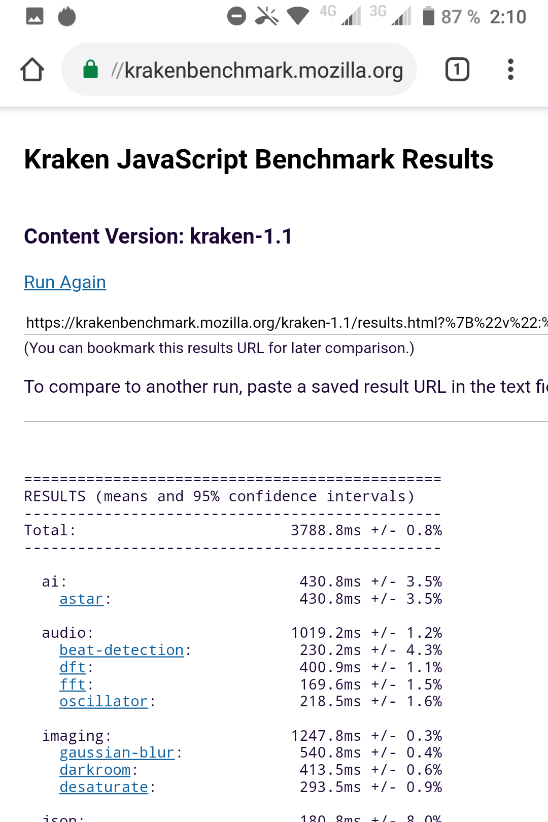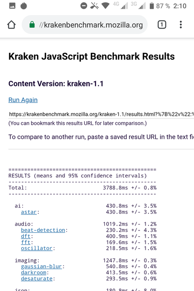 | Mozilla Kraken (мс, меньше — лучше) | 3789 | 4582 | 4561 | 4126 | 4487 |