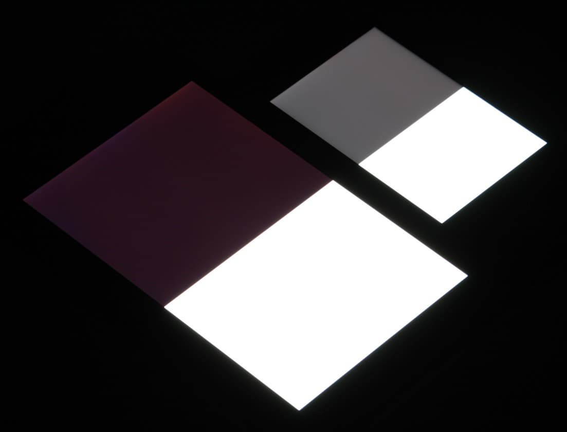 Черное поле при отклонении по диагонали сильно высветляется, но остается условно нейтрально-серым по оттенку. Фотографии ниже это демонстрируют (яркость белых участков в перпендикулярном плоскости экранов направлении одинаковая!):