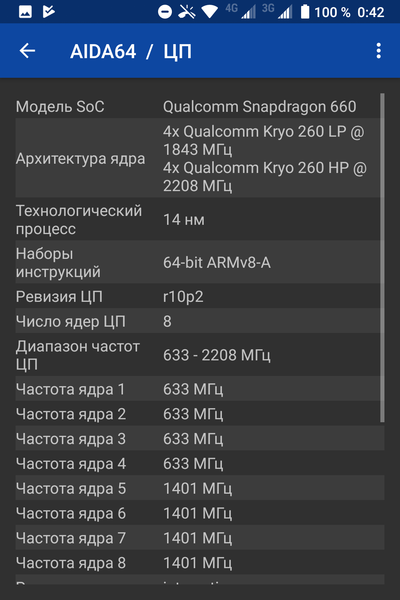 - SoC Qualcomm Snapdragon 660, 4 ядра Kryo 260 @2,2 ГГц + 4 ядра Kryo 260 @1,8 ГГц
