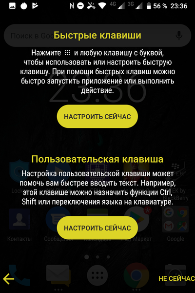 Впрочем, можно не пользоваться механическими клавишами вовсе: под экраном расположены еще и три сенсорные кнопки, которые выполняют стандартные функции кнопок обычного смартфона на Android (переход домой, назад и к списку открытых приложений). В клавишу «пробел» вписан сканер отпечатков пальцев. Для российского рынка официально предусмотрена локализация клавиатуры, на клавиши нанесены буквы русского алфавита наряду с латинским, но из-за разницы в числе символов алфавита некоторые русские буквы придется набирать двойным нажатием. Неприятно, но это единственный вариант для компактных решений.