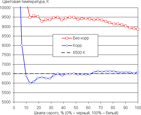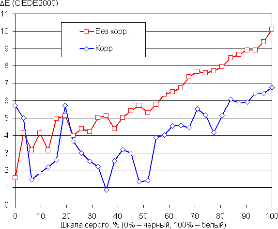 По умолчанию цветовая температура порядка 9000 К, но после коррекции баланс становится лучше: цветовая температура ближе к 6500 К, при этом на значимом участке шкалы серого этот параметр изменяется не очень сильно, что улучшает визуальное восприятие баланса цветов. Отклонение от спектра абсолютно черного тела (ΔE) остается ниже 10 единиц, что для потребительского устройства считается хорошим показателем. (Самые темные области шкалы серого можно не учитывать, так как там баланс цветов не имеет большого значения, да и погрешность измерений цветовых характеристик на низкой яркости большая.)