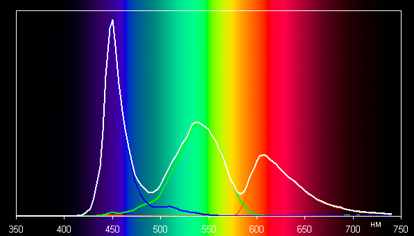 При этом горбы зеленого и красного цветов относительно хорошо разделены, что и приводит к некоторому уширению цветового охвата.