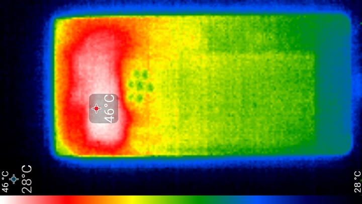 Нагрев локализован в верхней правой части аппарата, что, видимо, соответствует расположению микросхемы SoC. По данным теплокамеры, максимальный нагрев составил 46 градусов (при температуре окружающего воздуха в 24 градуса), это существенно выше среднего значения в данном тесте для современных смартфонов.