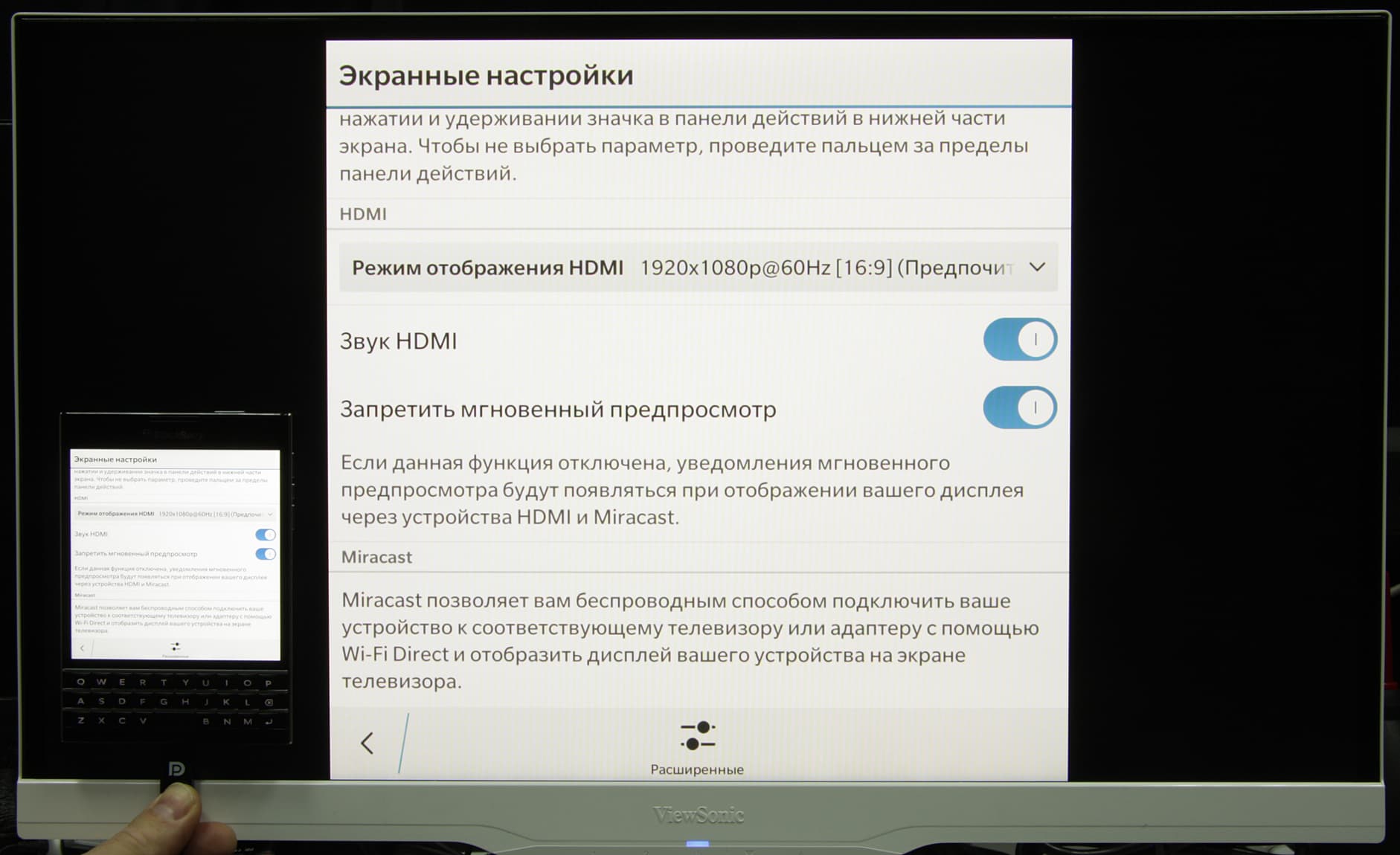В этом смартфоне есть поддержка адаптеров SlimPort (или Mobility DisplayPort), подключаемых к разъему Micro-USB и обеспечивающих передачу видеосигнала (и звука) на внешние устройства отображения обычно по стандартному HDMI. Для тестирования такого способа вывода видео мы использовали монитор ViewSonic VX2363Smhl и обычный безродный адаптер SlimPort. Режим вывода можно выбирать в меню установок самого смартфона. Мы остановились на рекомендуемом варианте с разрешением видеосигнала 1920 на 1080 пикселей с частотой 60 кадр/с. На экран монитора всегда выводится точная копия экрана смартфона, при этом изображение на мониторе вписано по высоте, а слева и справа на экране монитора выводятся широкие черные поля: