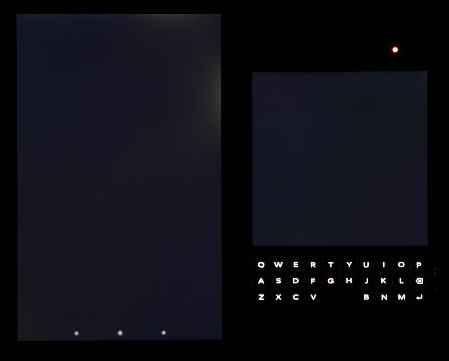 Лицевая поверхность экрана выполнена в виде стеклянной пластины с зеркально-гладкой поверхностью, устойчивой к появлению царапин. Судя по отражению объектов антибликовые свойства экрана не хуже, чем у экрана Google Nexus 7 (2013) (далее просто Nexus 7). Для наглядности приведем фотографию, на которой в выключенных экранах отражается белая поверхность (слева — Nexus 7, справа — BlackBerry Passport, далее их можно различать по размеру):