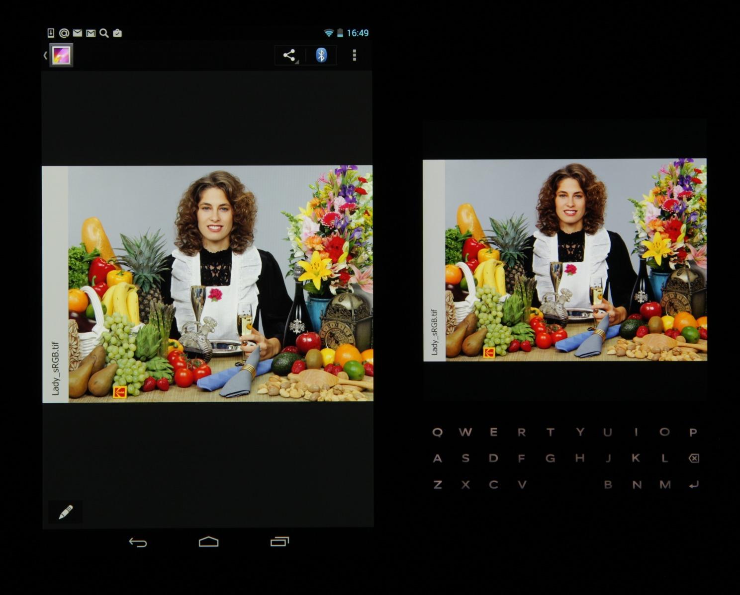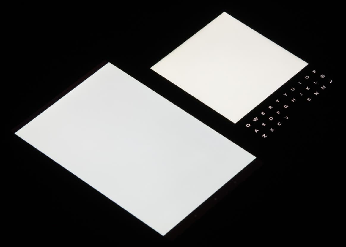 Экран имеет хорошие углы обзора без значительного сдвига цветов даже при больших отклонениях взгляда от перпендикуляра к экрану и без инвертирования оттенков. Для сравнения приведем фотографии, на которых на экраны BlackBerry Passport и Nexus 7 выведены одинаковые изображения, при этом яркость экранов изначально установлена примерно на 200 кд/м² (по белому полю во весь экран), а цветовой баланс на фотоаппарате принудительно переключен на 6500 К. Перпендикулярно к экранам белое поле: