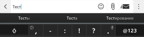 Для переключения языка достаточно кликнуть на кнопку с земным шаром. Если же нужно выбрать из нескольких вариантов, то надо удержать кнопку, и откроется меню выбора языков ввода, как показано на скриншоте. В процессе набора над виртуальной клавиатурой появляются три варианта того слова, которое вы набираете. Функция подсказок была одной из главных особенностей сенсорного BlackBerry Z10 — ее задача сводилась к тому, чтобы облегчить отказ от QWERTY-клавиатур и сделать набор текста более быстрым. Надо признать, что отчасти это удалось: система хорошо предсказывает набираемое слово даже на русском языке. Однако если в Z10 слова высвечивались прямо поверх виртуальной клавиатуры, и их можно было выбрать простым свайпом вверх в нужной зоне, то на BlackBerry Passport это реализовано иначе: здесь слово надо выбрать кликом. Сравним скриншоты с BlackBerry Z10 и BlackBerry Passport!
