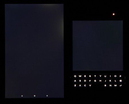 Яркость под углом у экранов уменьшилась (как минимум в 4 раза, исходя из разницы в выдержке), но в случае BlackBerry Passport падение яркости чуть меньше. Черное поле при отклонении по диагонали высветляется сильно и приобретает легкий фиолетовый, или красно-фиолетовый оттенок, или остается примерно нейтрально-серым. Фотографии ниже это демонстрируют (яркость белых участков в перпендикулярном плоскости экранов направлении примерно одинаковая!):