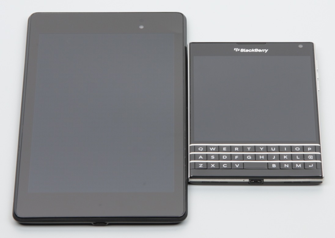 Экран у BlackBerry Passport немного темнее (яркость по фотографиям 112 против 114 у Nexus 7). Двоение отраженных объектов в экране BlackBerry Passport очень слабое, это свидетельствует о том, что между слоями экрана (конкретнее между внешним стеклом и поверхностью ЖК-матрицы) нет воздушного промежутка (экран типа OGS — One Glass Solution). За счет меньшего числа границ (типа стекло-воздух) с сильно различающимися коэффициентами преломления такие экраны лучше смотрятся в условиях сильной внешней засветки, но вот их ремонт в случае потрескавшегося внешнего стекла обходится гораздо дороже, так как менять приходится экран целиком. На внешней поверхности экрана есть специальное олеофобное (жироотталкивающее) покрытие (эффективное, может чуть лучше, чем у Nexus 7), поэтому следы от пальцев удаляются существенно легче, а появляются с меньшей скоростью, чем в случае обычного стекла.