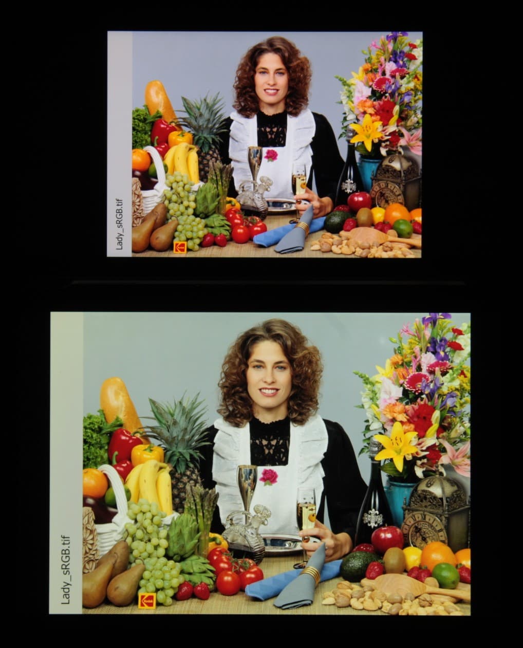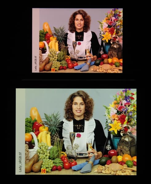 Цвета у тестируемого устройства чуть перенасыщенные, цветовой баланс у экранов различается. Напомним, что фотография не может служить надежным источником сведений о качестве цветопередачи и приводится только для условной наглядной иллюстрации. Причина в том, что спектральная чувствительность матрицы фотоаппарата неточно совпадает с этой характеристикой человеческого зрения.