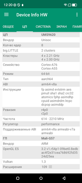 - SoC Unisoc T8100, 8 процессорных ядер (4×Cortex-A76 @2,2 ГГц + 4×Cortex-A55 @2,0 ГГц)