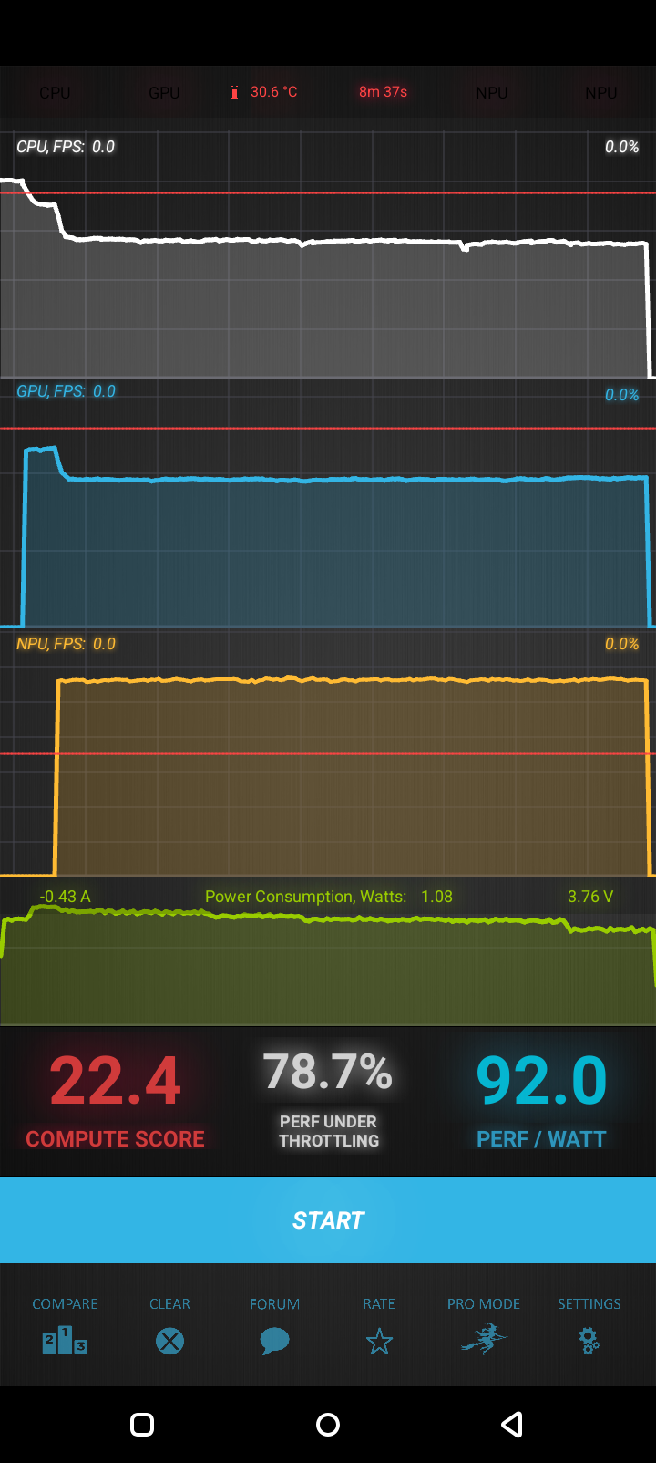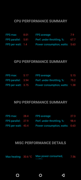 Тест на снижение производительности при нагреве мы проводим с помощью программы Burnout Benchmark, которая позволяет нагружать CPU, GPU и NPU. Уровень тротлинга невысокий, но это не особо помогает достигать рекордов производительности.