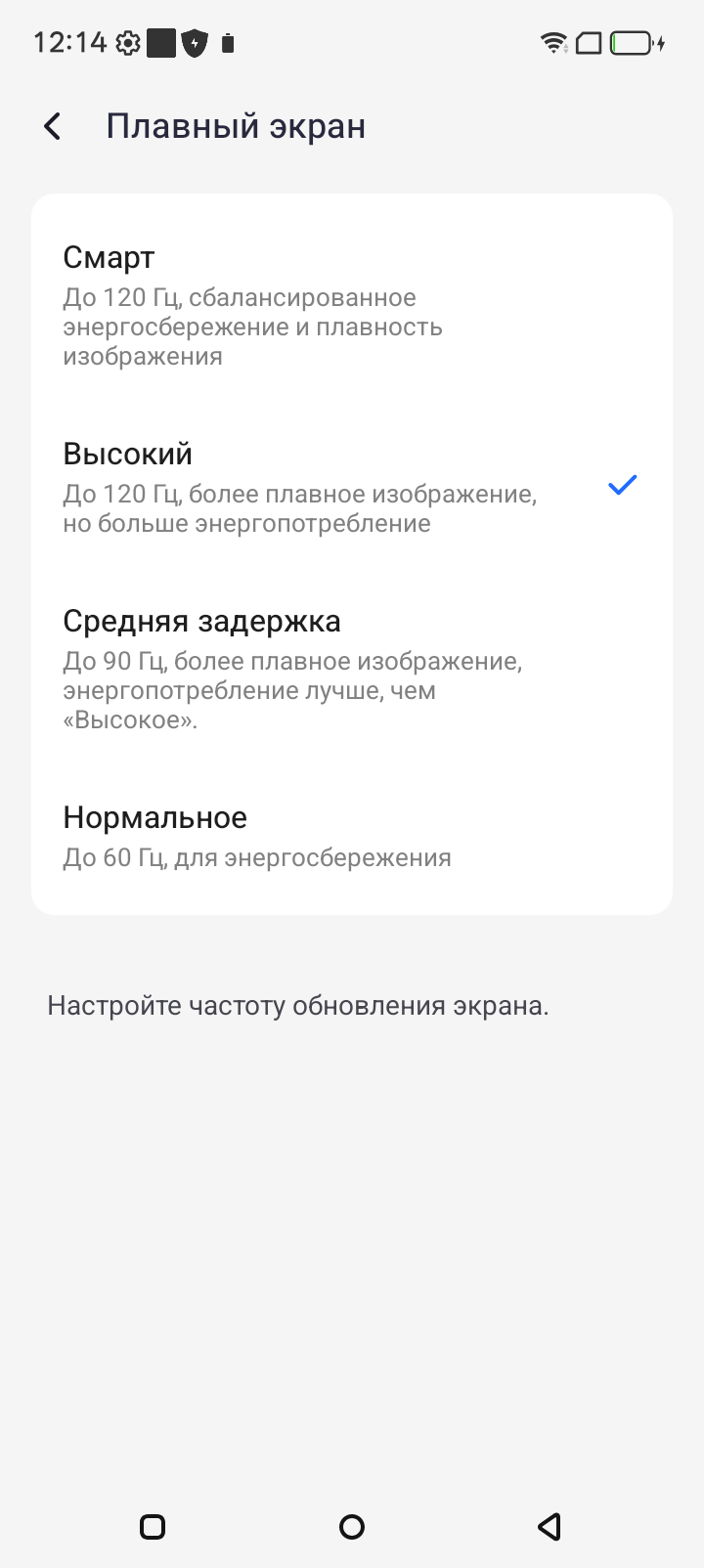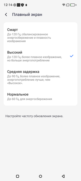 В настройках экрана можно включить режим с повышенной частотой обновления, но по факту даже при 120 Гц особой разницы с 60 Гц мы не увидели — плавность прокрутки списков не возрастает. Возможно это из-за слишком медленной матрицы. Однако, в браузере и в видеоплеере реальная частота обновления равна 60 Гц максимум. Есть ли эти 90/120 Гц на самом деле — непонятно.