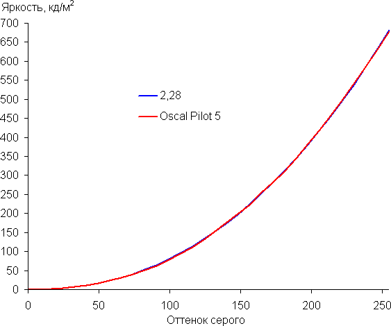 Контрастность (примерно в центре экрана) высокая — порядка 1700:1. Время отклика при переходе черный-белый-черный равно 24 мс (12 мс вкл. + 12 мс выкл.). Переход между полутонами серого 25% и 75% (по численному значению цвета) и обратно в сумме занимает 39 мс. Построенная по 32 точкам с равным интервалом по численному значению оттенка серого гамма-кривая не выявила завала ни в светах, ни в тенях. Показатель аппроксимирующей степенной функции равен 2,28, что выше стандартного значения 2,2, поэтому картинка чуть затемнена. При этом реальная гамма-кривая мало отклоняется от степенной зависимости: