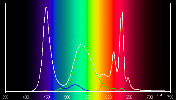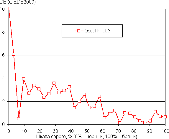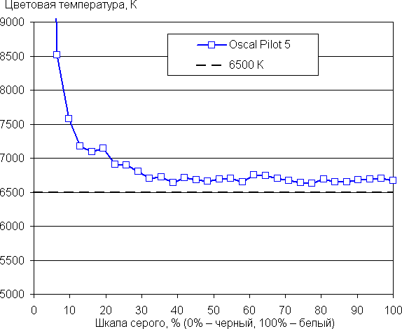 Баланс оттенков на шкале серого без коррекции средний, так как цветовая температура существенно выше стандартных 6500 К — порядка 8000 К на белом фоне. После коррекции оттенков в теплую сторону (точка на круге — как на снимке выше) цветовой баланс удается улучшить — цветовая температура уже достаточно близка к стандартным 6500 К, и отклонение от спектра абсолютно черного тела (ΔE) ниже 10, что для потребительского устройства считается приемлемым показателем. При этом цветовая температура и ΔE мало изменяются от оттенка к оттенку — это положительно сказывается на визуальной оценке цветового баланса. (Самые темные области шкалы серого можно не учитывать, так как там баланс цветов не имеет большого значения, да и погрешность измерений цветовых характеристик на низкой яркости большая.)