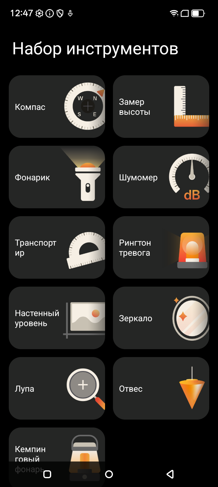 Также есть дополнительные приложения: целый набор программ для путешественника — компас, транспортир, лупа, уровень, отвес, высотомер. Особое место занимает редкий гость — лазерный дальномер, с помощью которого можно измерить расстояние или площадь.