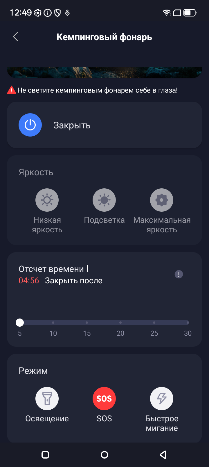 Он может освещать пространство в течение суток от одной зарядки. Мощность фонаря высокая (410 люмен), есть несколько режимов работы, включая аварийный.