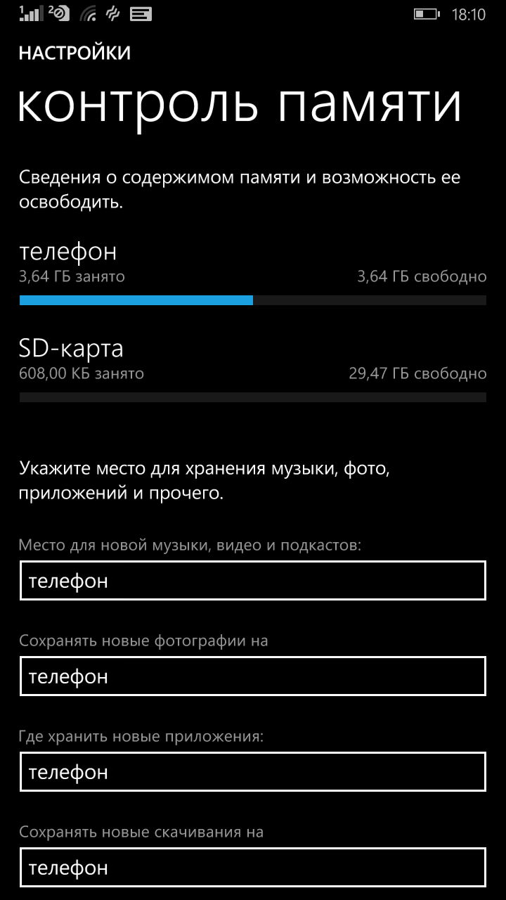 Объем оперативной памяти устройства составляет 1 ГБ, что в сегменте Windows можно считать средним уровнем. Большинство приложений для этой платформы будут работоспособны на устройстве. Что касается флэшпамяти, то из установленных 8 ГБ на новом устройстве пользователю доступно около 4 ГБ. После установки обновлений прошивки этот объем сокращается до 3,6 ГБ.