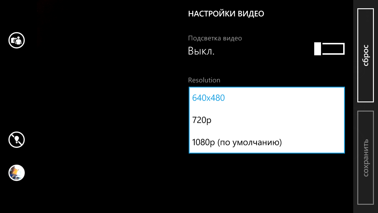 В настройках записи видео можно только выбирать разрешение. Для основной камеры в процессе съемки есть опция включения подсветки светодиодом вспышки. Напомним, что для записи звука в этом сценарии используется только микрофон, расположенный на задней панели.
