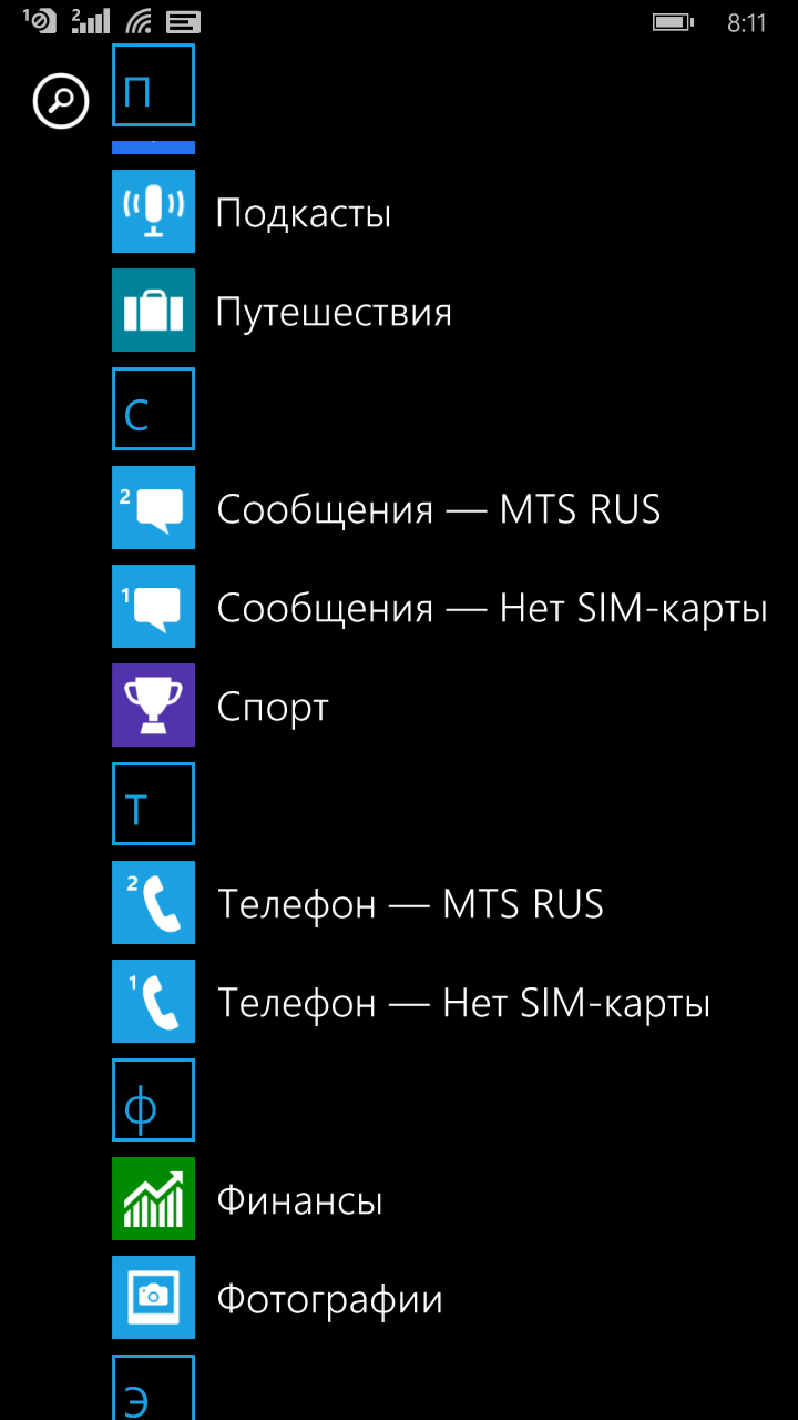 Для выбора карт при звонке или написании SMS, на рабочем столе присутствуют две пары соответствующих плиток. Если используется только одна карта, второй комплект можно просто удалить.